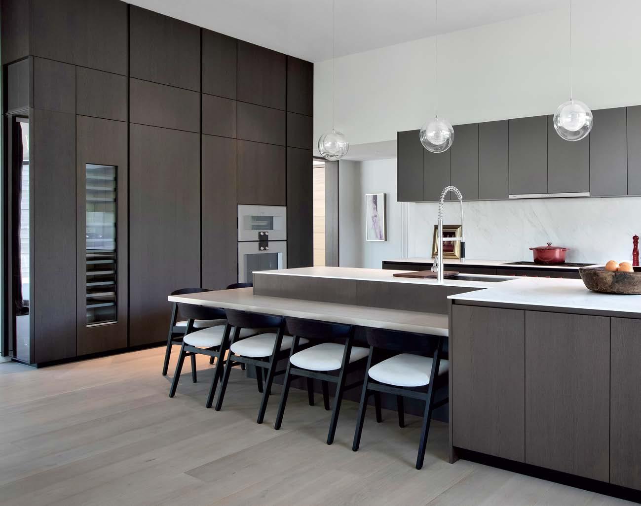 This sleek and striking kitchen includes two Wolf ovens alongside a Sub-Zero refrigerator and freezer hidden behind the project-defining custom panels.