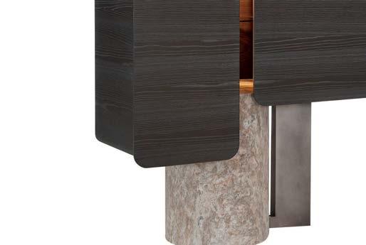 Playing off the ocean views throughout the residence, natural colors ground the palette, stemming once again from the columns’ blue-andgray quartzite. “We wanted to intensify that tone,” the designer explains. “And just because we’re on the water doesn’t mean we have to use only blues—the ocean can be a neutral voice.” Amid charcoals and sandy hues, she sprinkled in touches such as emerald green in artwork, clay accents in accessories and a deep raisin in the primary bedroom.
