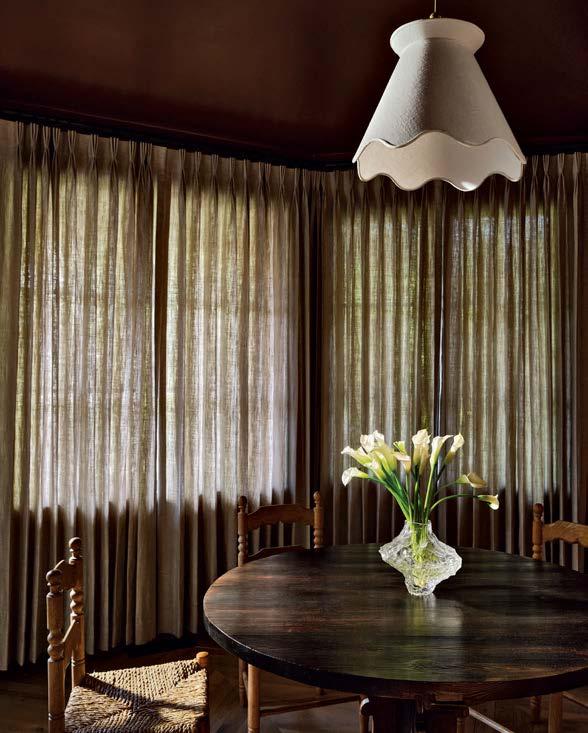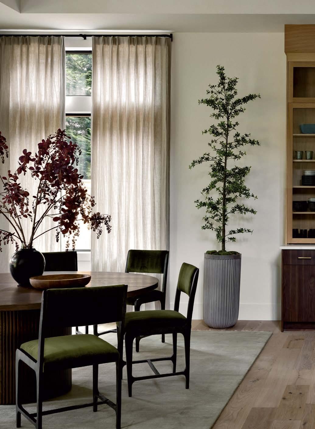 Above: Made Goods chairs surround an RH table in the breakfast room. The planter is from Pottery Barn, and the tabletop pieces were found at Dixon Rye. Draperies made by Lesley Petty Studio diffuse the light.