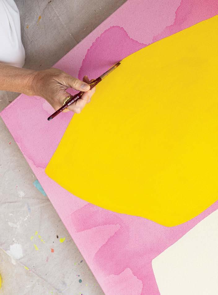 Mia Farrington’s bold, colorful paintings include pieces such as Gestural Study No. 1 LENI and Ink Study No. 2 (opposite, from top to bottom) as well as Ink Study No. 1 (left). The artist sketches and color tests on raw canvas (below).