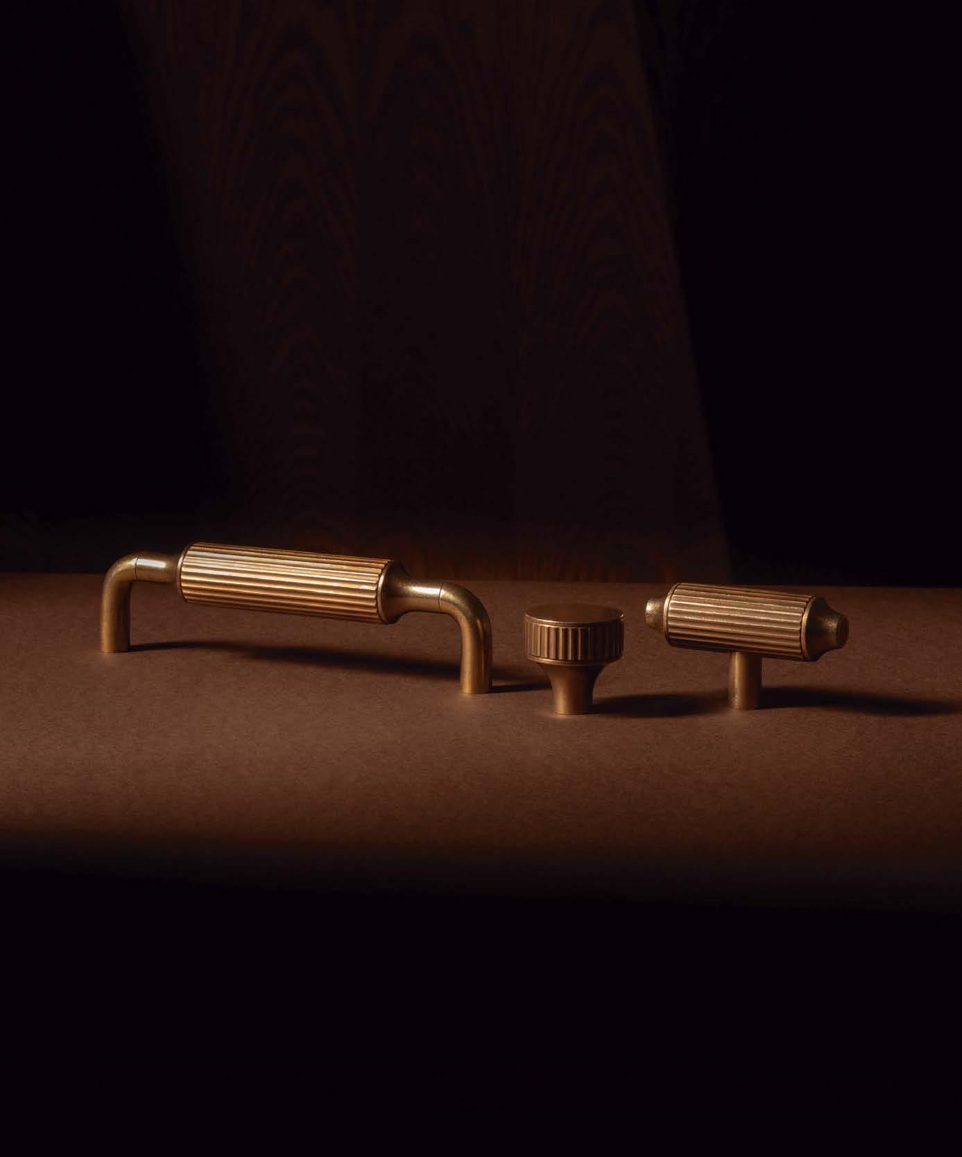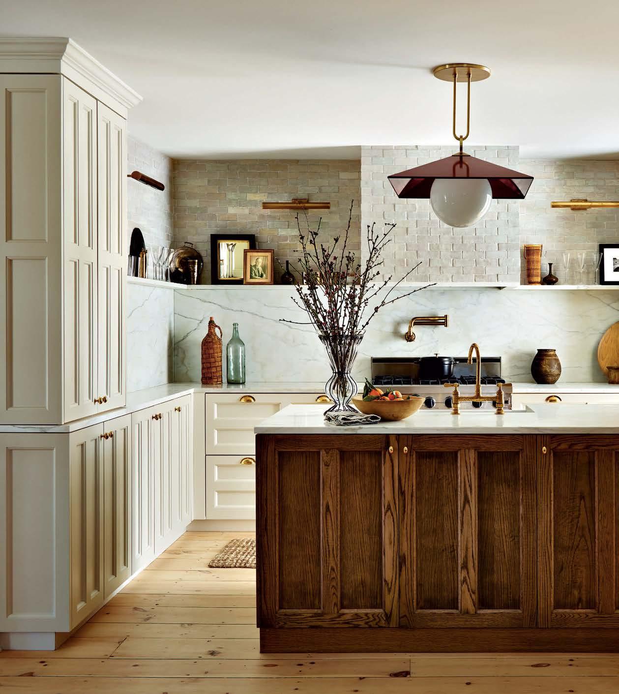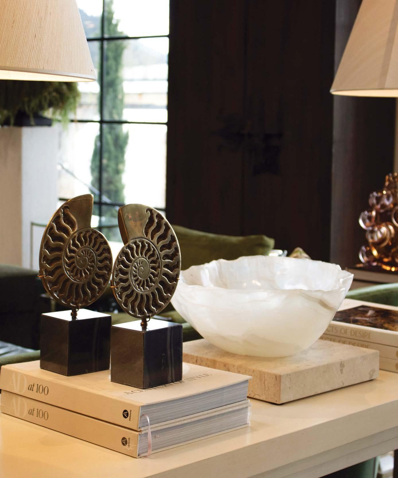 “Everything has a texture to it in these mineral, earthy tones,” Cruse says. Lighting also has a vintage, industrial quality, featuring patinated metals, smoked glass and translucent white shades.