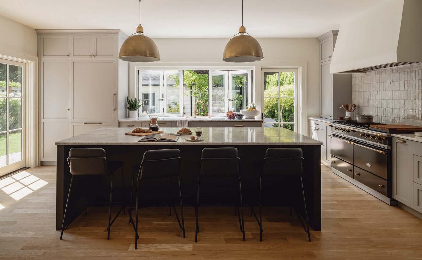 Emerald City Cabinet Company crafted the kitchen cabinetry, accented by countertops from Mokastile and a Jeffrey Court backsplash tile. The Wolf range is paired with a Monogram hood, and the faucets are by Brizo.