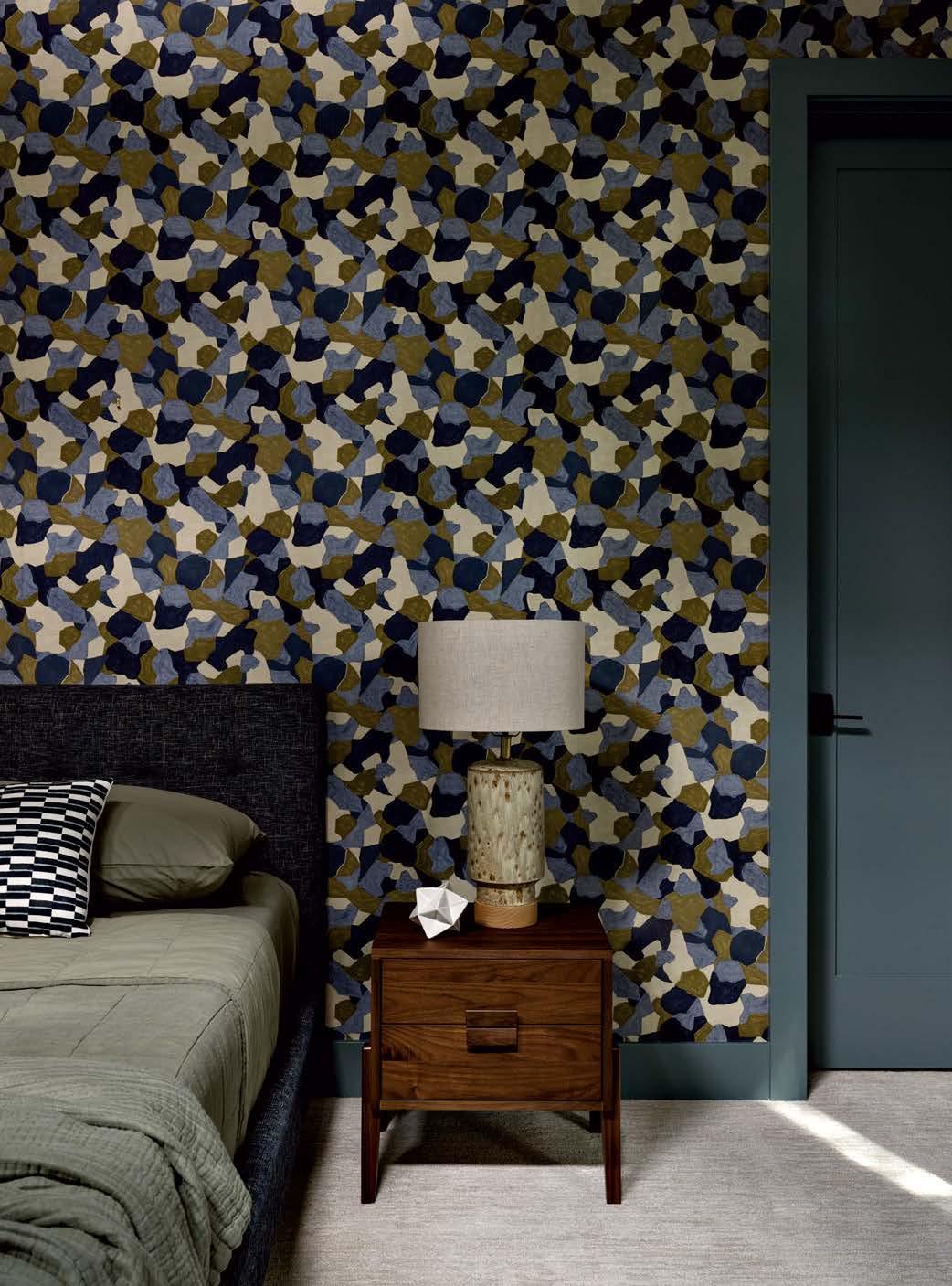 Opposite: Lining the walls in the son’s room is a Wayne Pate-designed wallpaper for Studio Four NYC; the trim is painted Farrow & Ball’s De Nimes. Atop the bed and nightstand from Article are Parachute linens and a Natan Moss Design lamp, respectively.