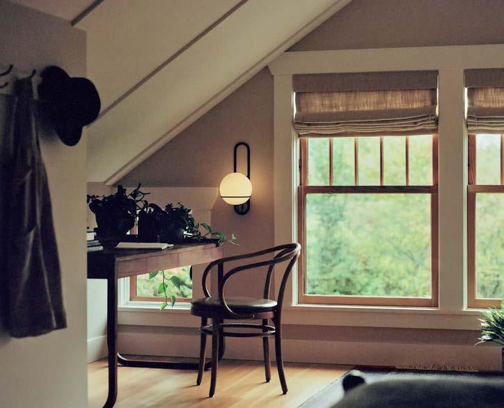 home’s original fireplace, the living room pairs sofas (Cobb at right, Sofia at left) by Room with a Charlotte Perriand for Cassina bench that serves as a coffee table. Architect Philip Burkhardt specified new Marvin windows and doors to connect with the site.
