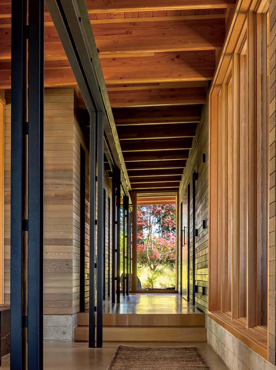 Maintaining an immediate connection with the vineyards below, the bedrooms along the home’s private wing “all open out onto a covered patio space,” notes residential designer Rick Berry. Views are framed by a colonnade of steel beams and sliding glass doors from Sierra Pacific Windows.
