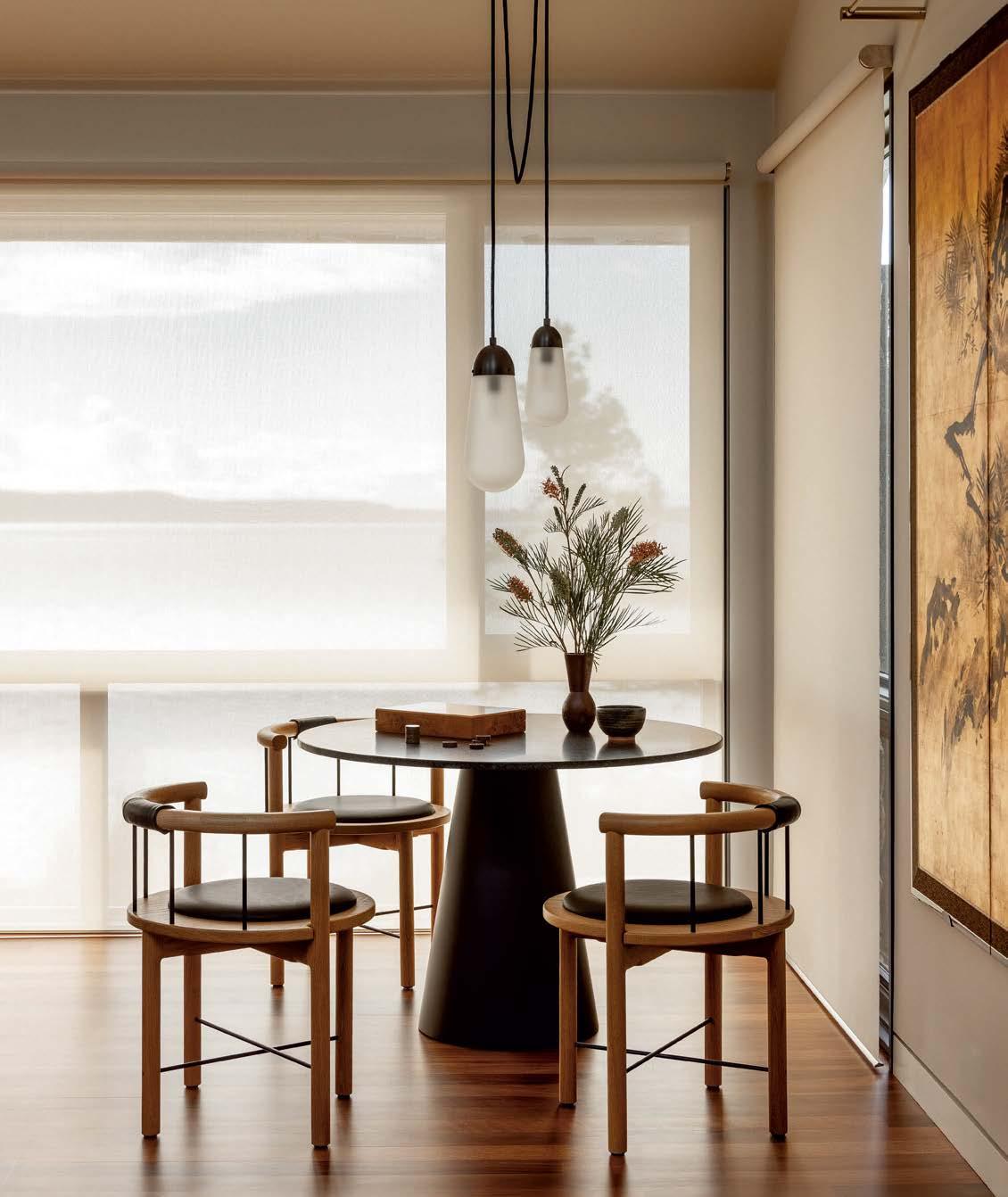 Those desires became the core mission for the team, which included senior designer Laura Cariaso and general contractor Doug Guard. “We removed walls that made the living room, dining area and kitchen discrete spaces,” Burkhardt notes. “The home, which is shaped like a boomerang, had just one sliding door and several high-silled windows on the view side. By replacing all those with a series of floor-toceiling glass doors and windows, we were able to create a space that allows the interior to seamlessly join the landscape.”