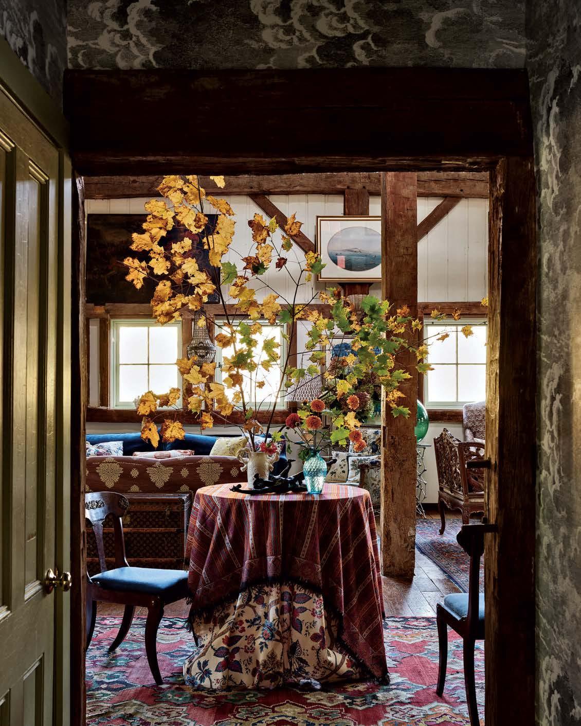 we found ourselves drawn to The Fife Arms in Scotland, a place we’ve stayed,” the wife explains. “The hotel was inspiring because it displays things in such interesting ways. There’s a focus on nature and layers of plaids, prints and paintings— and I saw a bit of that in Brian’s work with the way he layers fabrics and colors.”