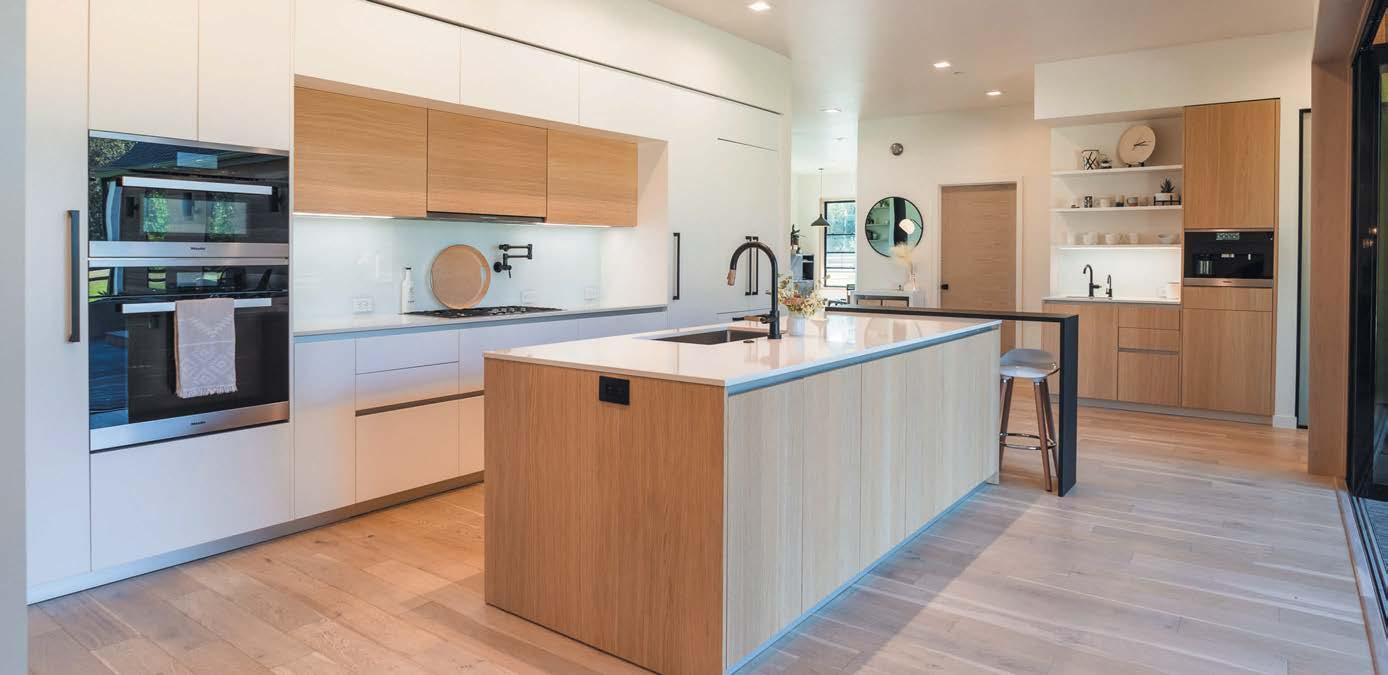 Top Pedini NW created this sleek, sophisticated kitchen in Bend, Oregon. Right Pedini’s new Dogata ribbed, curved cabinet doors—also available in flat doors—add sculptural appeal. Far right Pedini’s Revego pocket door system elevates this handsome hidden bar.