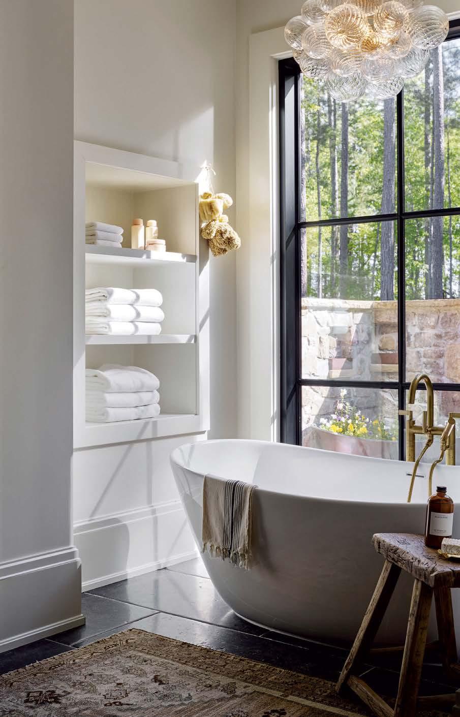 Right: Julie Neill’s Talia chandelier for Visual Comfort & Co. adds a glamorous note to the primary bathroom. The Watermark brass tub filler complements Belgian bluestone flooring from TileBar.