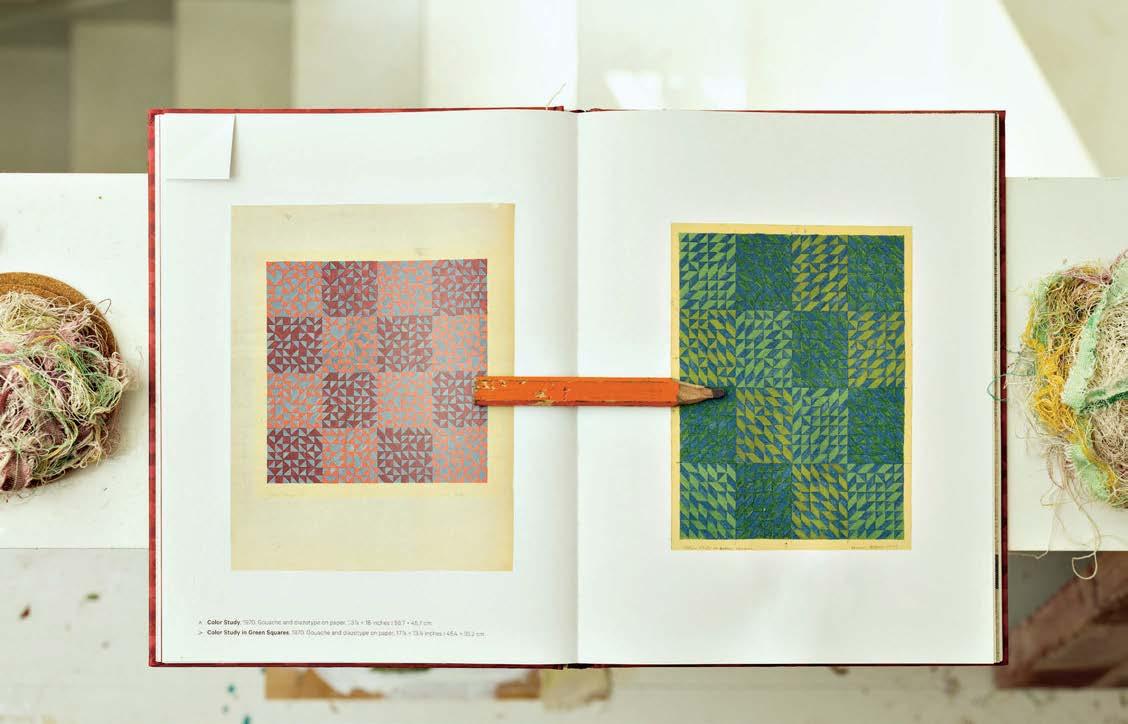 Artist Laura Deems’ light-filled Birmingham studio (opposite) stows the broad scope of her mixedmedia portfolio, including her gestural paintings, fiber works and screen prints. The artist employs a squeegee tool to render one of her signature swooshes (left). Strips of frayed and dyed canvas await reorganization into woven arrangements (below). The oeuvre of 20th-century masters Josef and Anni Albers deeply inspires Deems as seen in the colorful grids of this reference book (bottom).