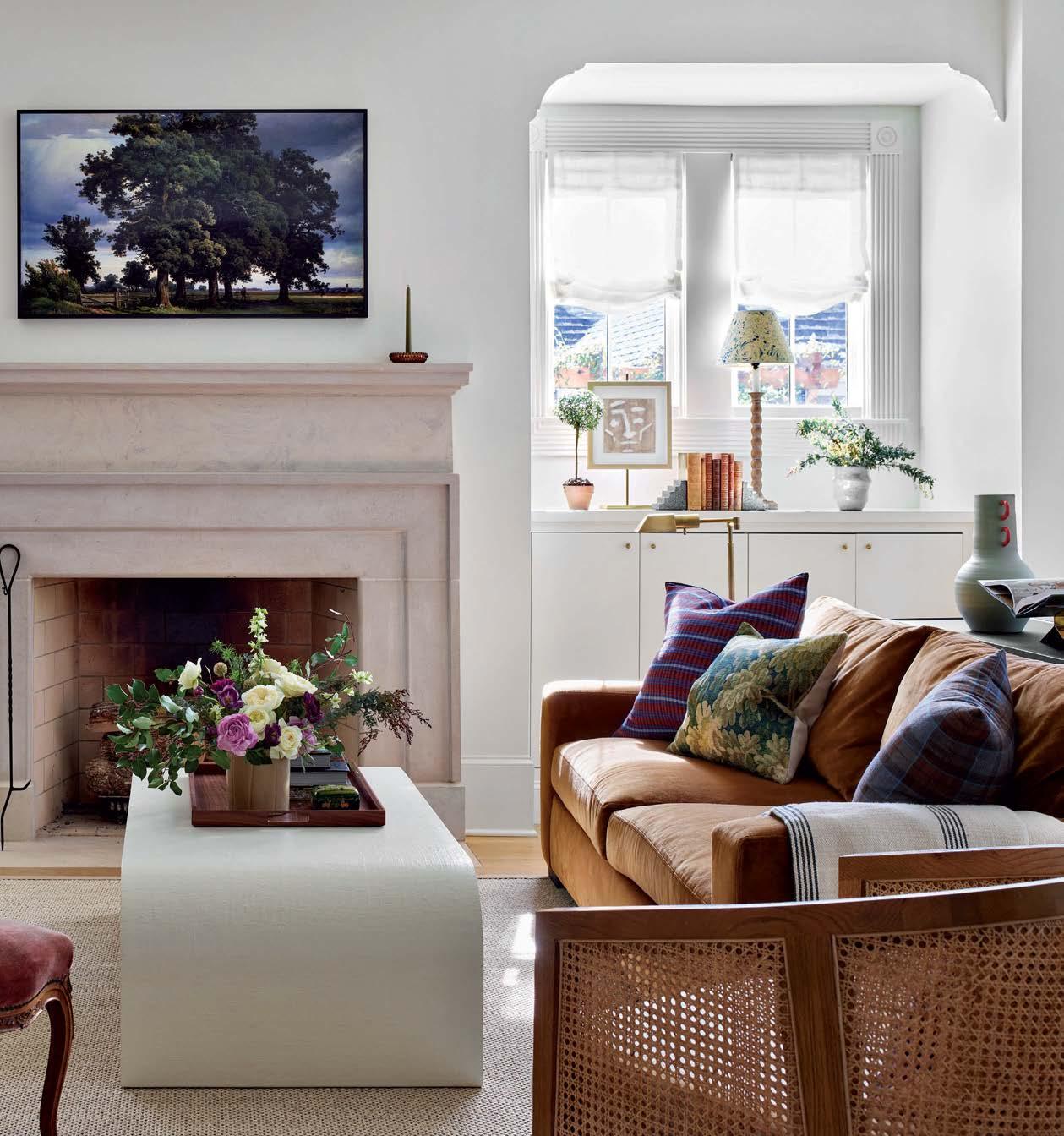 A lacquered coffee table by CB2 anchors the family room, where Lee Industries sofas from UpCountry Home don S. Harris’ Lulu velvet and pillows of Cotwan & Tout’s Richmond linen. Barrel chairs—a swivel style by Lee Industries and a cane version by Crate & Barrel—join petite upholstered stools from Chairish.