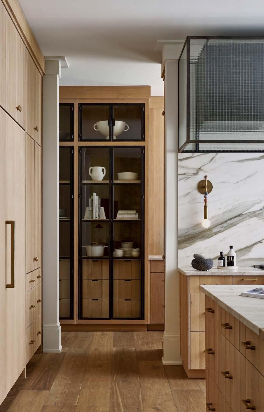 Right: The pantry boasts custom cabinetry by Webber Coleman Woodworks accompanied by Monarch floors from HD Flooring Solutions. Apparatus’ Talisman sconce accents Walker Zangersourced porcelain on the backsplash.