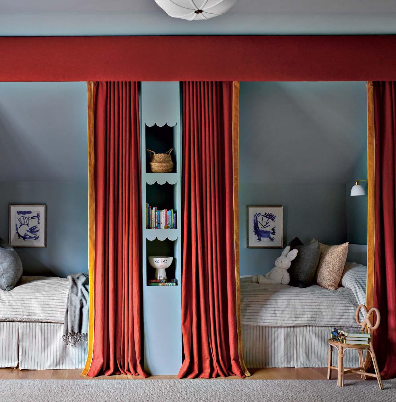 Right: A scalloped bookshelf by Claw-hammer Woodworks dials up the darling factor in the children’s playroom. The draperies—featuring Fabricut’s Pacific linen and Samuel & Sons’ Sloane velvet trim— were made by Home Accent, Inc. The beds are dressed in Ballard Designs bedding.