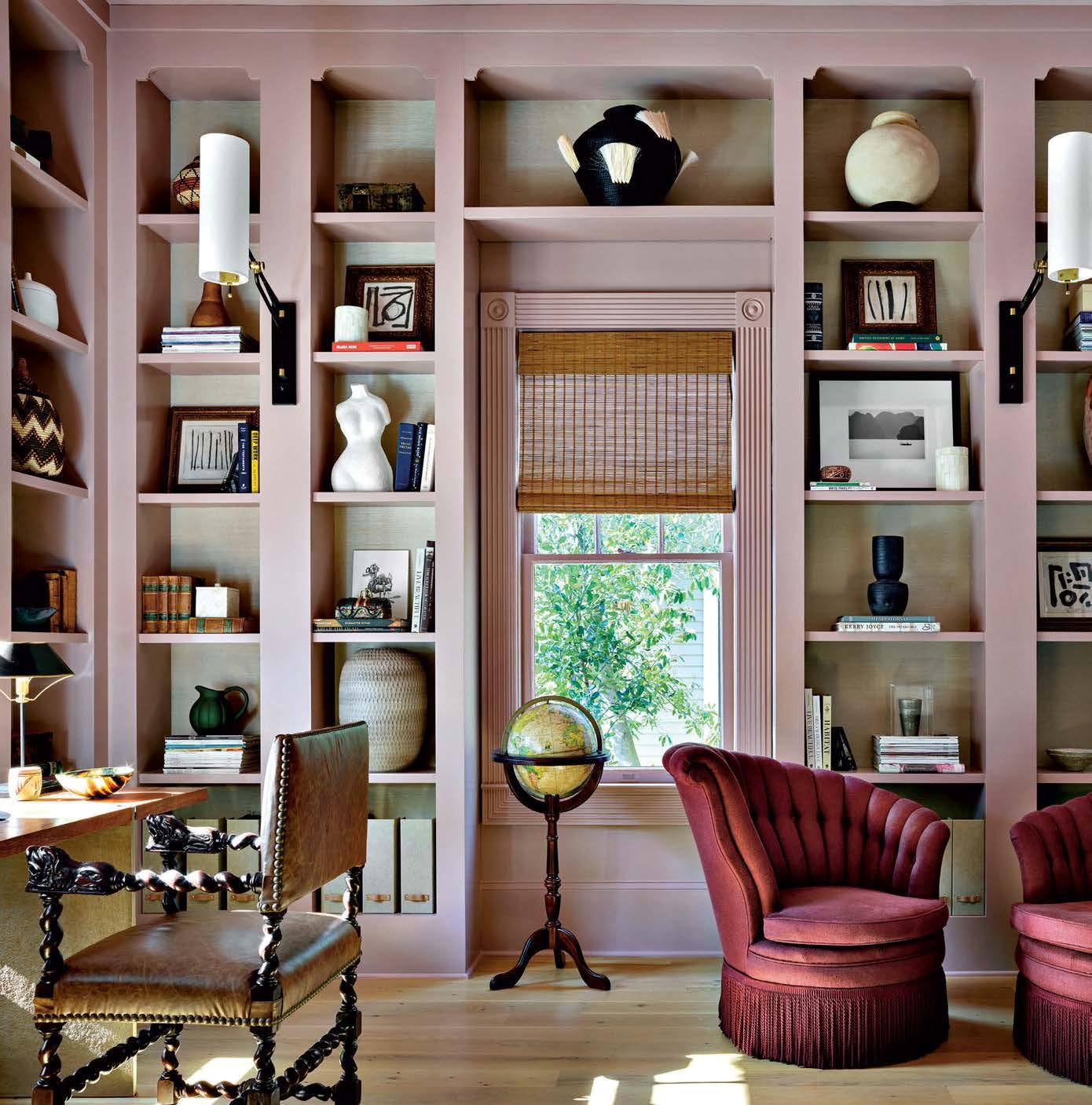 Above: Benjamin Moore’s Monet paint lends a soulful shade of blush to the study. A 19th-century English side chair sourced at Kudzu Antiques + Modern perches beside one of the home’s seven original fireplaces—this one touting Daltile’s glossy ceramic Rittenhouse tile.