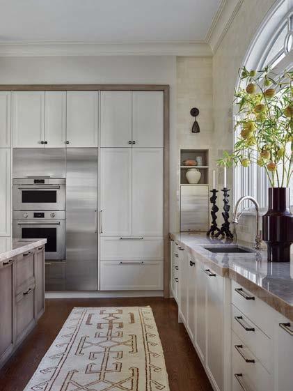 bathroom suite on the first floor into the new formal dining room and pantry—two spaces that perfectly accommodate the owners’ love of entertaining. Nearby, the footprint of the oversize primary suite was reconfigured to accommodate convenient his-and-her bathrooms. And upstairs, a hangout space for the couple’s teenage children emerged from a former playroom. “So much of this project was about paring down,” the designer explains. “It was a lot of simplifying spaces and bringing them to a more modern place.”