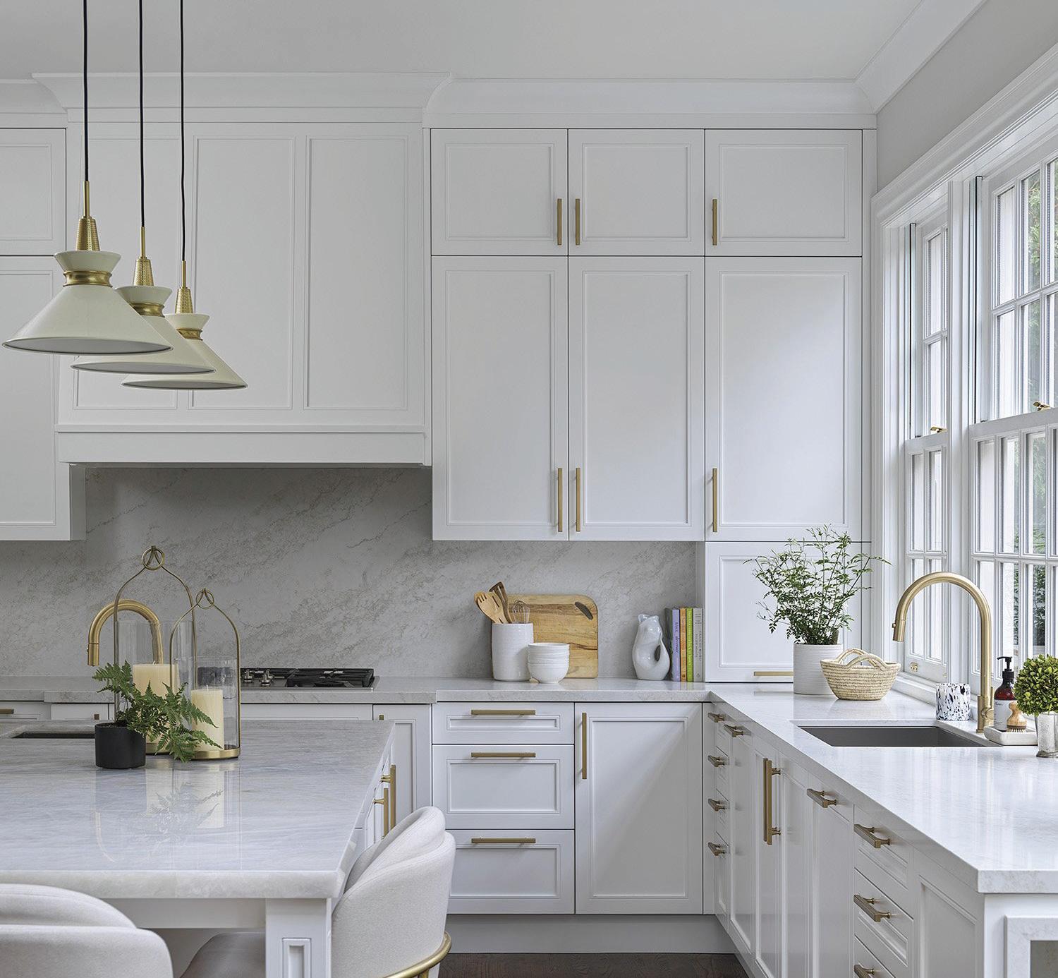 To complement the existing island's marble, the new countertops and tiles were selected in soft white tones. "We picked a timeless, natural stone in white brick from Nanda Tiles. I love these tiles because they are made to look 'imperfect,' which gives the kitchen a more nostalgic and old-world feel," says Sunderani. For the countertops, Pure White quartz by Caesarstone. "I absolutely love the sleek, minimalist feel of this countertop," she says.