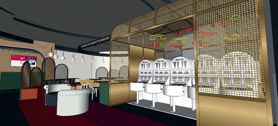 La demande de départ était de transformer le Purple Lounge sans dénaturer son essence, ce qui avait plu tant d’années à la clientèle du CASINO 2OOO. Pas simple... J’ai donc décidé d’épurer, de moderniser, sans toutefois enlever le côté chaleu reux du lieu. Il fallait que cela reste chic, simple, confortable, coloré, avec un caractère affirmé… Tout en plaisant au plus grand nombre. L’équipe souhaitait aussi attirer une clientèle plus jeune et pas coutumière du lieu. J’ai donc gardé les co des d’origine (la couleur mauve, les matières nobles, l’am biance feutrée). Et j’ai ajouté des éléments plus fun (des petits clins d’œil çà et là), j’ai associé le mauve à des couleurs peps et complémentaires, j’ai créé un éclairage varié.