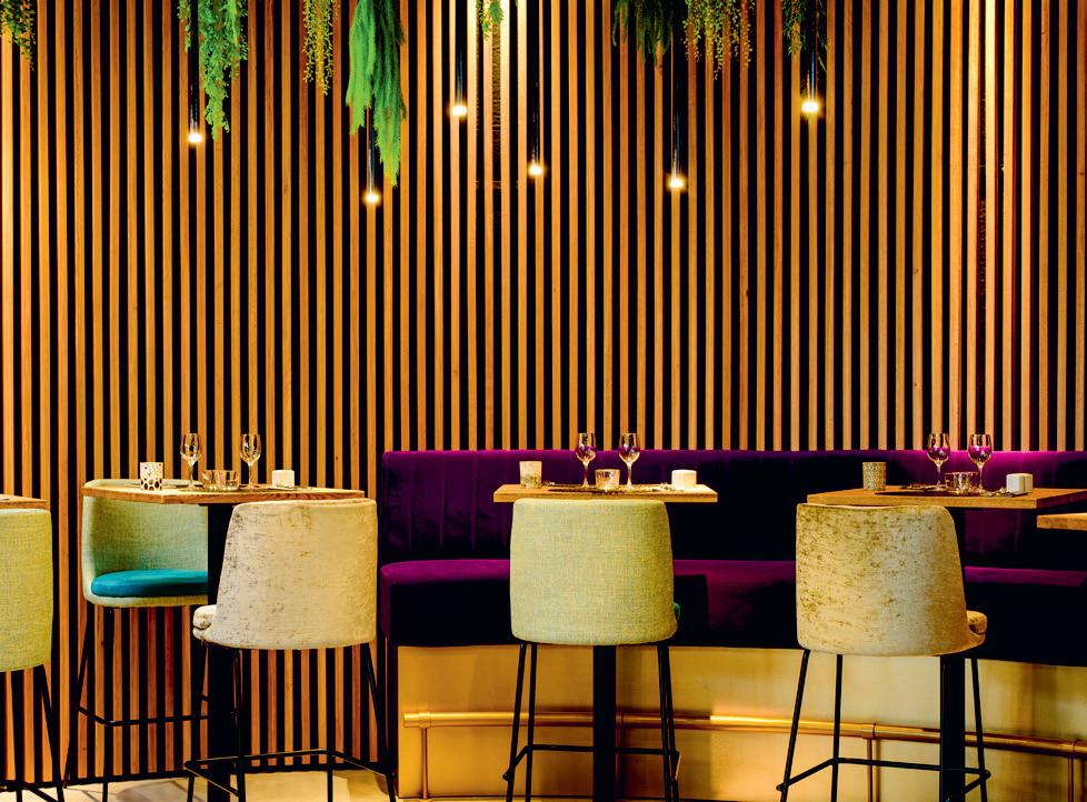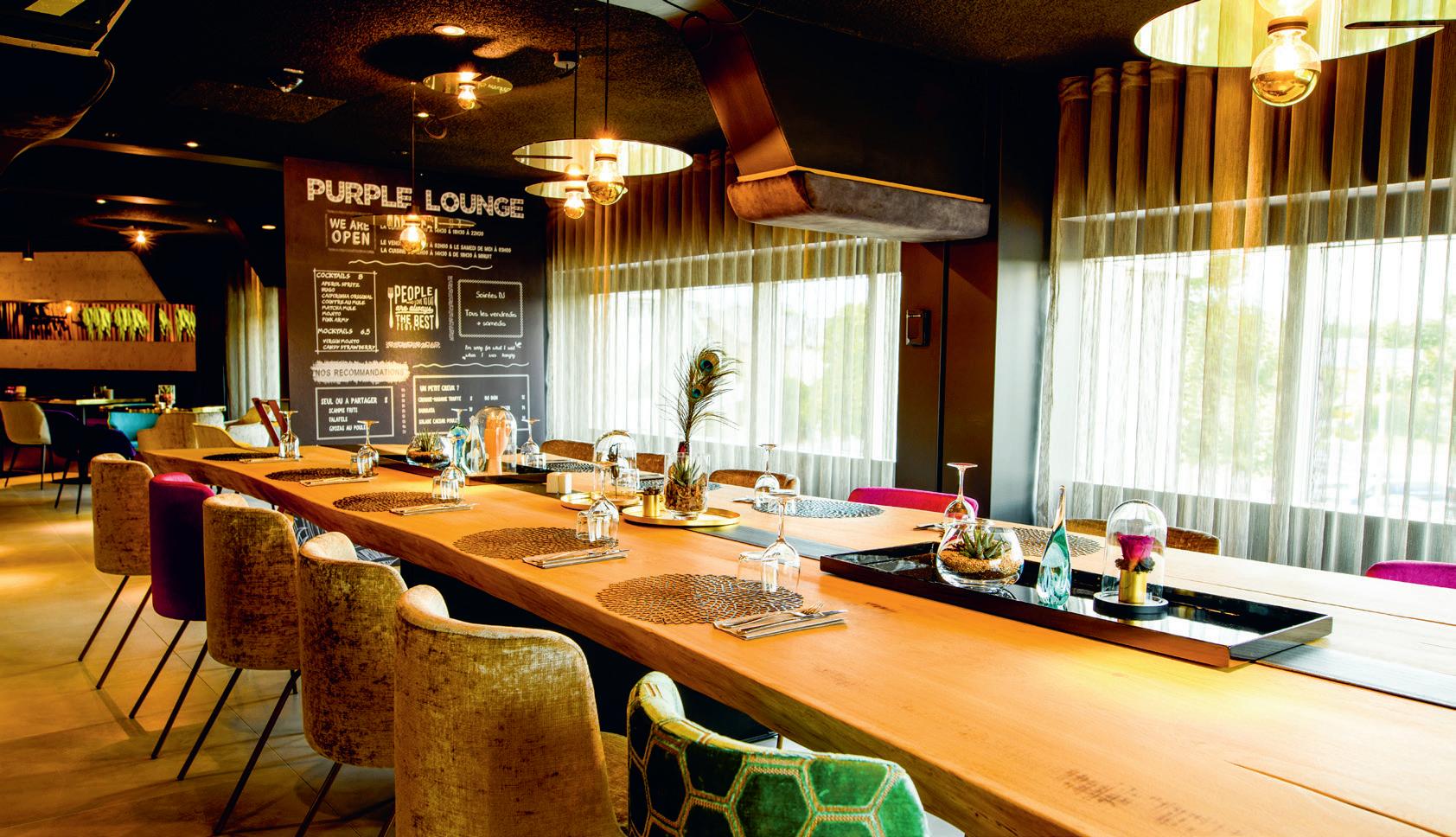 J’ai apprivoisé les reliefs du plafond en plaçant des tables rondes en dessous et des banquettes, qui structurent l’es pace et qui y font écho et j’ai créé une «attraction» avec les suspensions lumineuses. C’est le cœur du Purple !