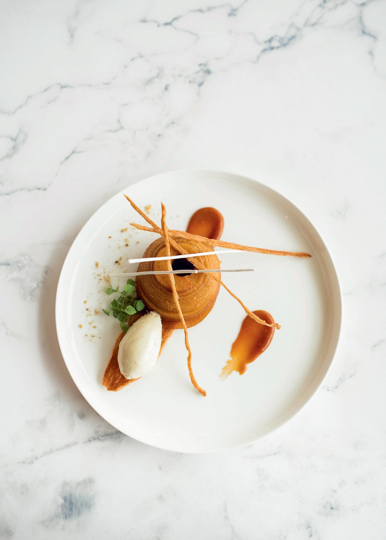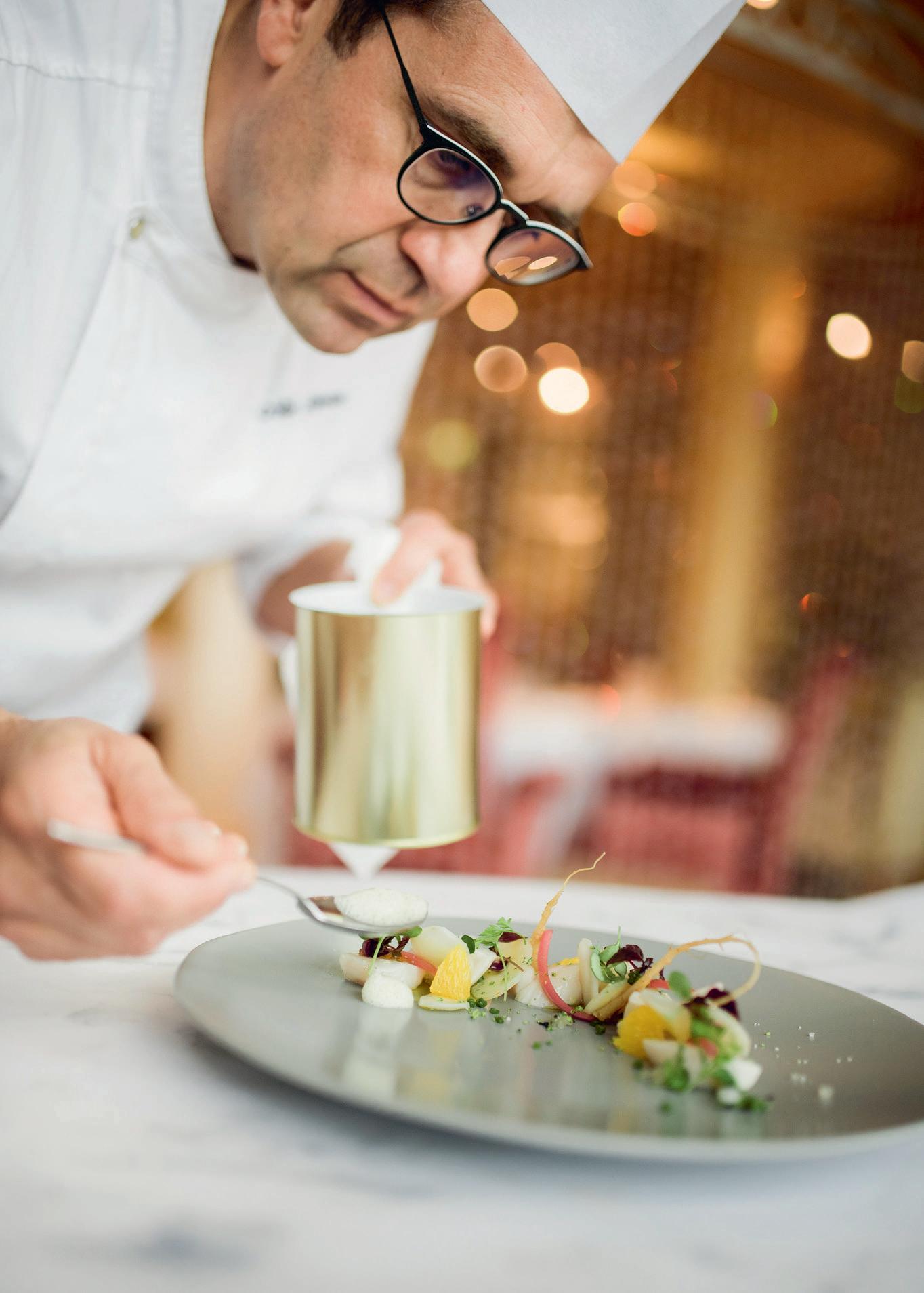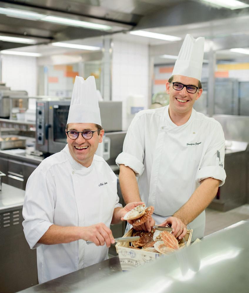 Mais Alain Pierron n’oublie pas les végétariens… Pour lui, c’est impor tant de faire manger tout le monde. Et cela ne date pas d’hier! Il y a plus de 10 ans, il a participé à un concours national autour de l’huile d’olive. Après avoir fait partie de la sélection des 10 finalistes, il fut le seul à proposer un plat 100% végétal et a gagné. Mais la démarche vient parfois directement des clients. «Il y a peu, une cliente m’a demandé pour son mariage de faire un menu végétarien, seuls les œufs étaient autorisés. Pour moi, c’est vraiment une cuisine à part entière. Ce qui me fait plaisir, c’est de voir que, quand on a une table de quatre personnes par exemple où l’on a deux personnes qui mangent végétariens et deux qui mangent de façon classique, dans l’assiette on retrouve quasiment la même chose.» Cannelloni de cucurbita cées de pays avec des graines de chia torréfiées, espuma de maïs au curry rouge… le plat 100 % végétal présenté sur la nouvelle carte n’a rien à envier aux autres propositions du menu. Vous découvrirez dans ses pages un menu haut en couleur et en saveurs… Pour les gourmets, Alain Pierron va enfin pouvoir cuisiner son produit fétiche, la Saint-Jacques. On la retrouve en deux préparations. Une première, froide en sashimi avec un citron caviar, agrémentée de jeunes poireaux cuits au four, condiments de mangue aux baies roses et dentelles de seigle. En version chaude, elle est juste snackée parsemée de copeaux de bonite séchée, ou katsuobushi (variété de thon) avec une poêlée de chayottes et salsifis, gel de poivre vert au vinaigre de riz. Et pour couronner le repas, voici une réinterprétation de la Tatin. Une pomme confite au four avec un beurre demi-sel, caramel au beurre demisel, glace vanille et feuilletage croustillant à la cassonade. Bonne dégustation…