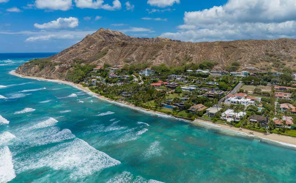 Honolulu, Oahu | 2,320 SQFT 800 SQFT Lanai | 3BR/2.5BA MLS# 202509670 | $3,495,000 is stunning, private property nestled high on the slopes of Diamond Head Crater, offering breathtaking views of the city, ocean, mountains, and romantic golden sunsets. e pocketing sliding doors open up to create a sense of spaciousness, making this home a fi rst-class retreat for the entire family. With sophisticated styling and calming hues, Leahi Villa features an interior that exudes luxury, complemented by expansive indoor/outdoor living areas. e gourmet kitchen and built-in barbecue area are set against a backdrop of lush landscaping, complete with outdoor shower and panoramic views. Enjoy the swimming pool out the back of the property or the many activities available in this world class location. Live Oahu’s Gold Coast lifestyle at its fi nest!”