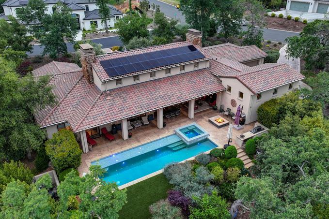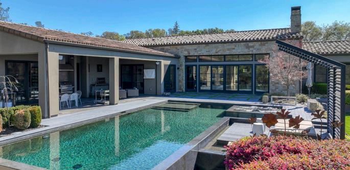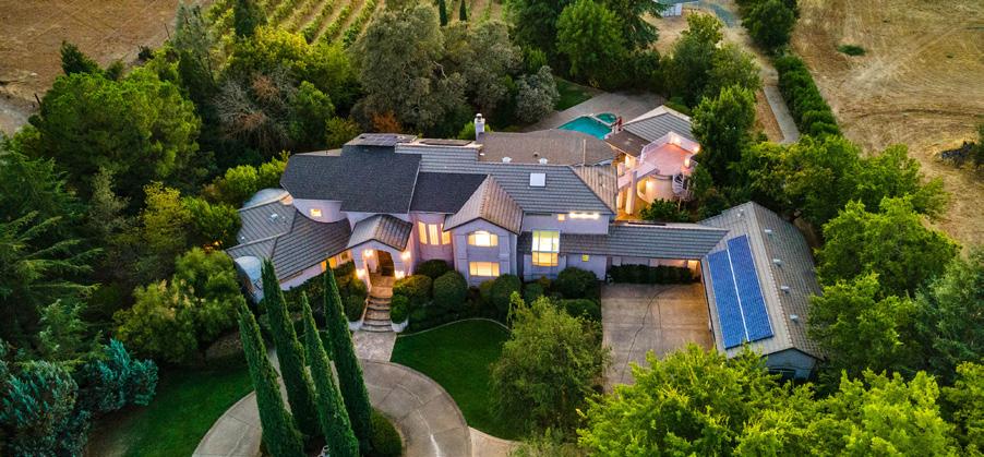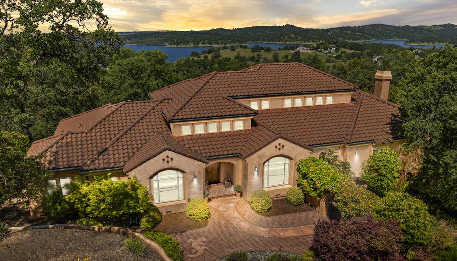 721 Shoreline Pointe, El Dorado Hills • price upon request | Private 1 acre parcel surrounded by vineyard and olive trees behind private gate in Southpointe. Boasting over 7300SF with views over Folsom Lake. Main level primary suite, library and guest bedroom en-suite. Great room concept opens to over 1100SF lanai with fireplace. Stunning kitchen. Downstairs secondary bedrooms, office, laundry and huge bonus room. 4 car garage plus ADU. Separate workshop with roll up door. Resort rear yard with pool, spa, golf green, firepit and pool house with full bath.