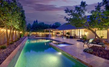• Resort-style backyard with pool, spa, waterfall, slide, gazebo, and covered patio