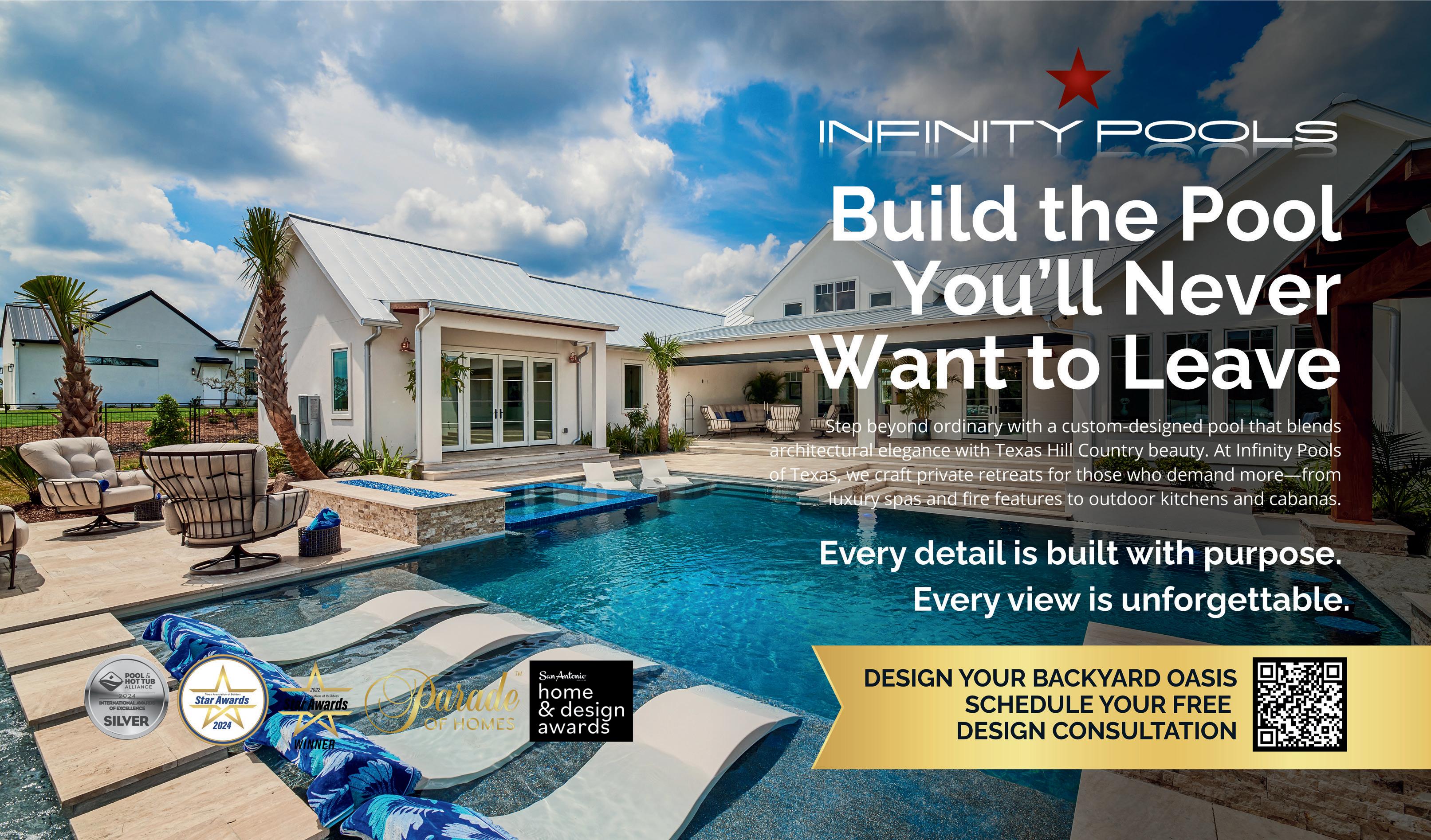 Our cover home on page 4, presented by Debra Janes of Niche Properties, introduces a new benchmark for single-level estate living in Anaqua Springs Ranch. Spanning 5,000 square feet on over two private, tree-covered acres, this exquisitely curated residence blends sophisticated design with resort-style amenities. A temperature-controlled wine room built to house 3,000 bottles anchors the home, while chef-caliber kitchens invite elevated entertaining. Every inch reflects careful attention to detail and an uncompromising standard of luxury.