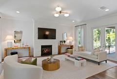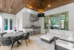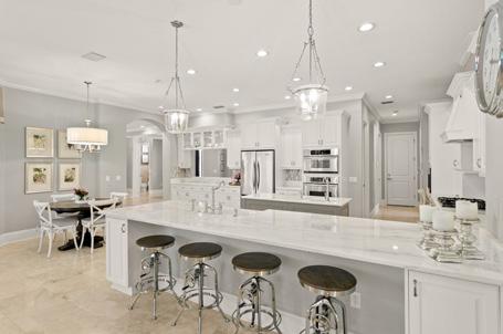 Inside, you're greeted by driftwood-style flooring, shaker cabinetry, and under-cabinet lighting that set the tone for a light and breezy coastal aesthetic. The gourmet kitchen is a true showpiece— featuring gleaming quartz countertops, herringbone tile backsplash, an oversized prep island, hidden walk-in pantry, and top-of-the-line appliances — all designed with both form and function in mind. The spacious great room flows seamlessly between dining and living spaces and opens to a deep covered balcony with waterfront views overlooking the pool, ideal for indoor-outdoor entertaining.