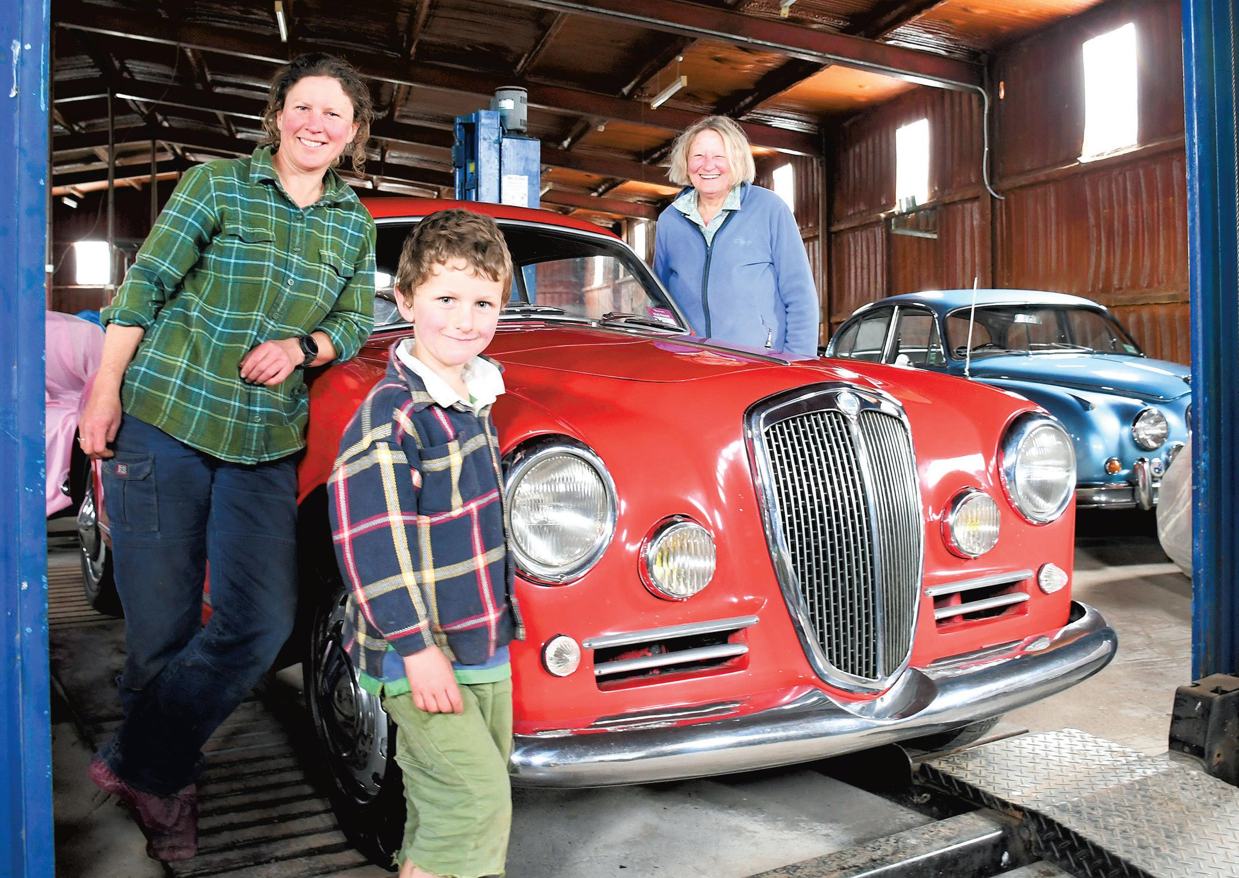 Kim’s sister Margaret, hisniece Megan and great-nephew Finch enjoying the Lancia Lambda before the auction begins.