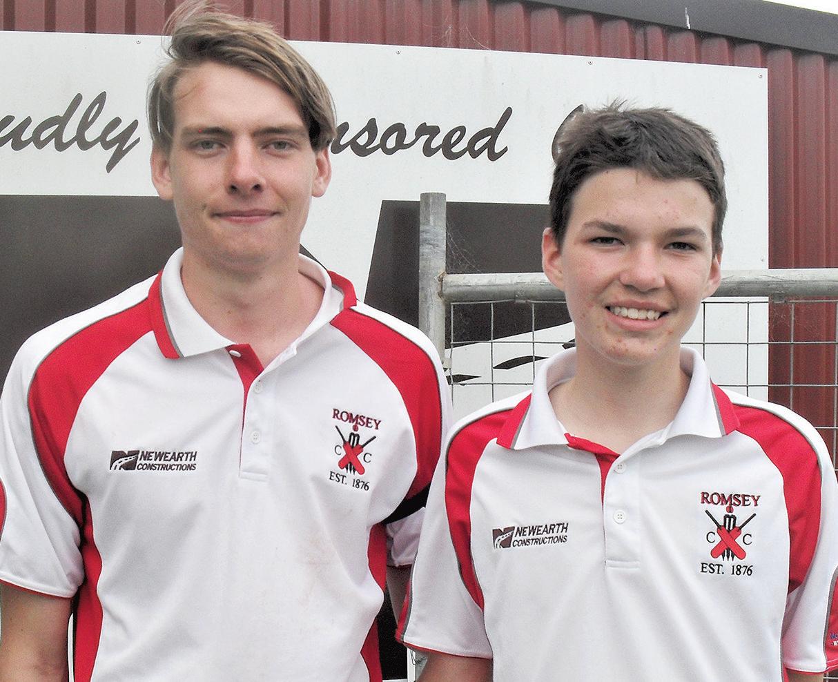 To the rescue: Struggling forruns against Riddell, Romsey’sdivision twoside was rescued by aprolongedlast wicket partnership between allrounder MatthewChew (at left) and Logan Collins. Theysurvived for10overs and added 37 runs to pave the wayfor agood win, with Chewcapturing three wickets as well.