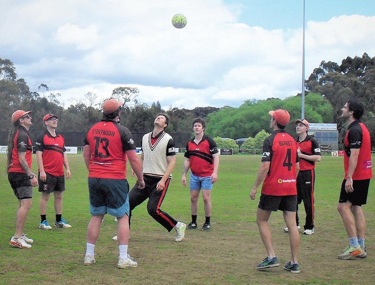 Warming up! Romsey’sMcIntyre Cup cricketers, with captain-coachBen Wayinthe centre,havechalked up twowins from twomatches and their warming up routine would probably impresssome keen soccer fans.