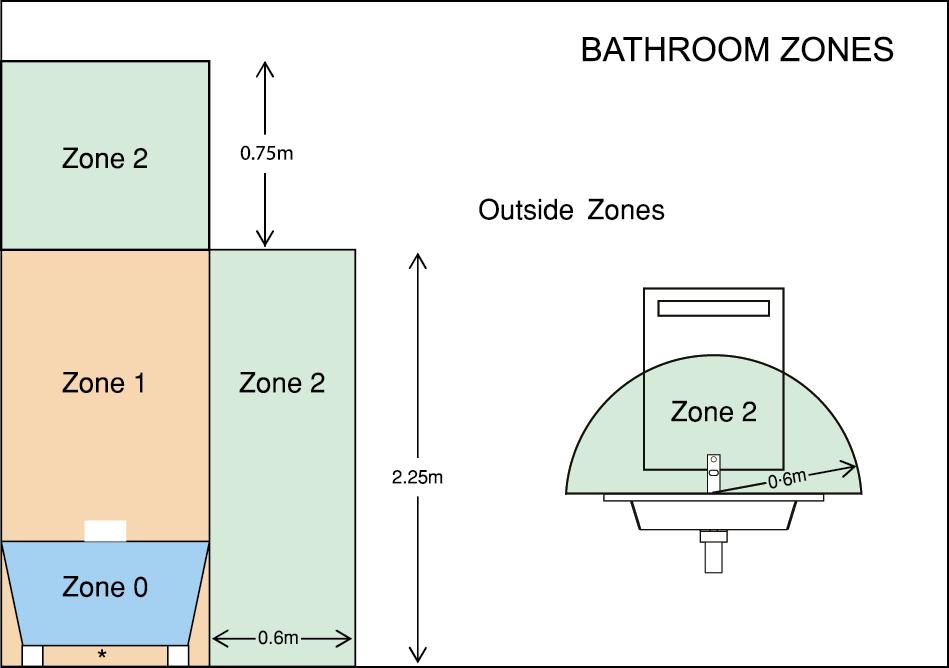 Zone 1 Perimeter of bathtub or shower tray up to a height of 2.25m above the floor - IP44.
