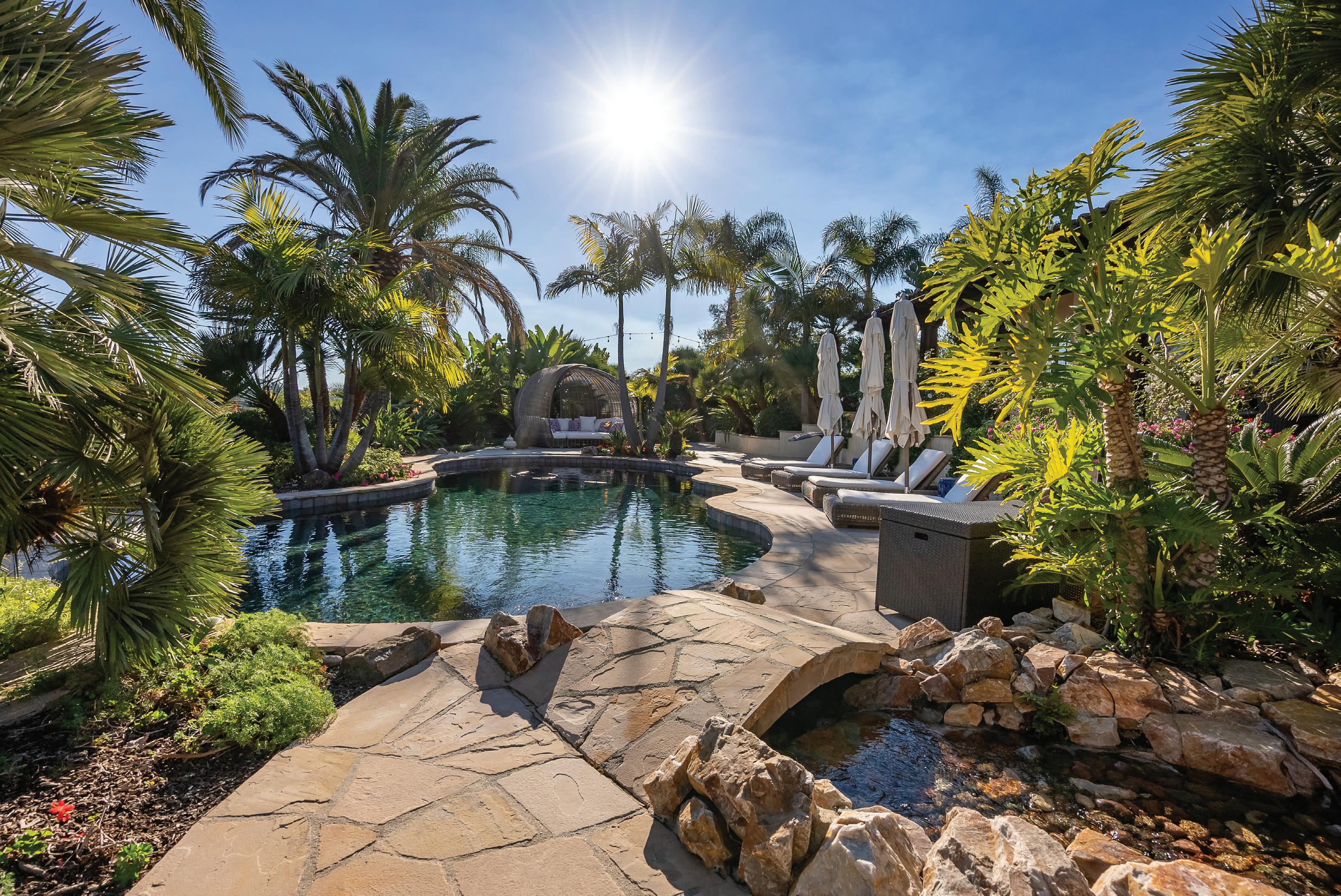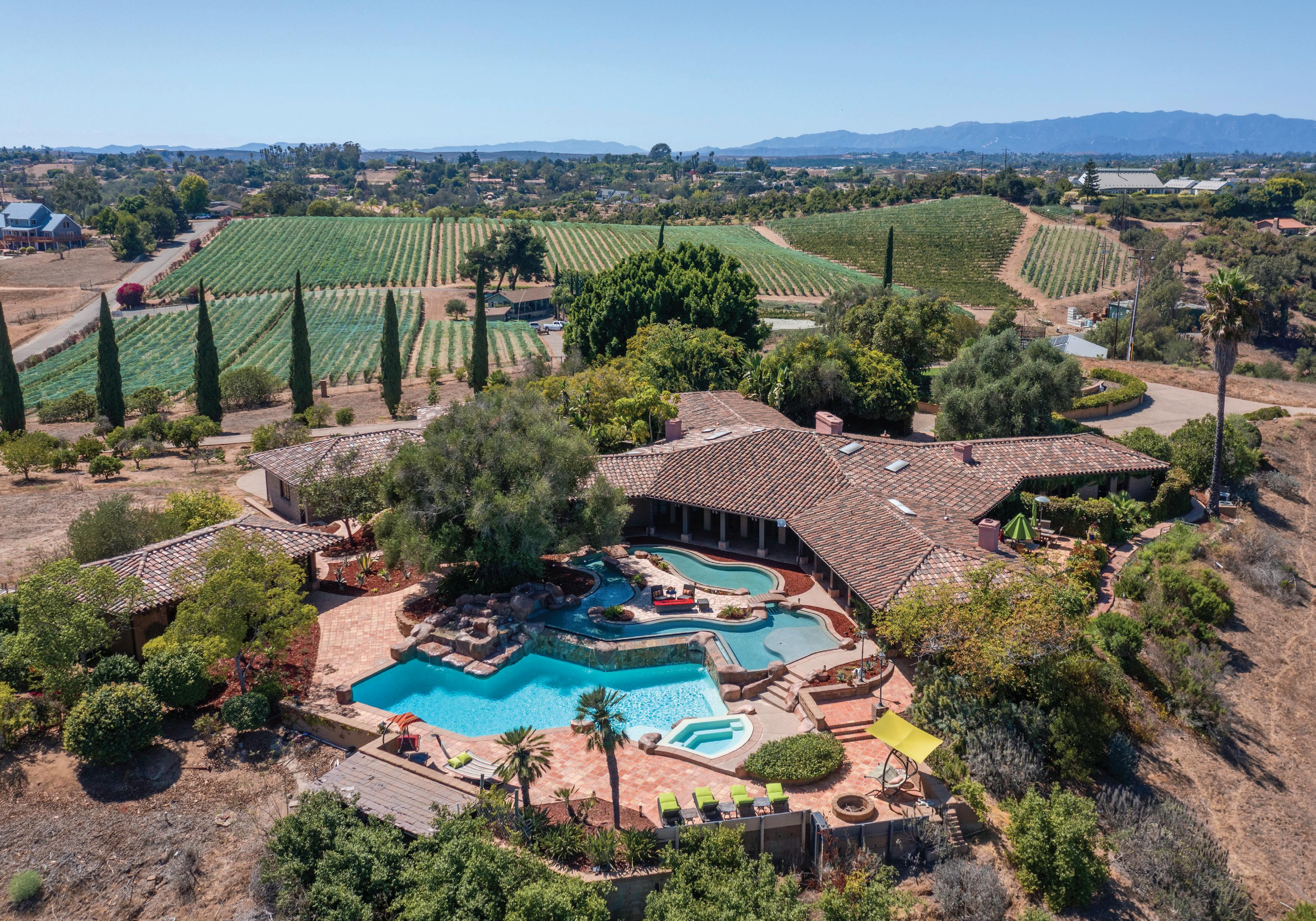 has an expansive primary retreat with his/hers newer spa baths, custom closets, an ensuite office/library/yoga room and private covered terrace. The lower level has a billiards room, gym, outdoor game room, office, wine cellar and more. The 2 BD guest house includes living room/bar, 2 fireplaces. Spectacular mountain views and Kate Sessions designed “Secret Garden”. Salt water pool with newer equipment, and pool house. Just minutes from the Village, beaches, shopping, Roger Rowe and Rancho Santa Fe Schools.