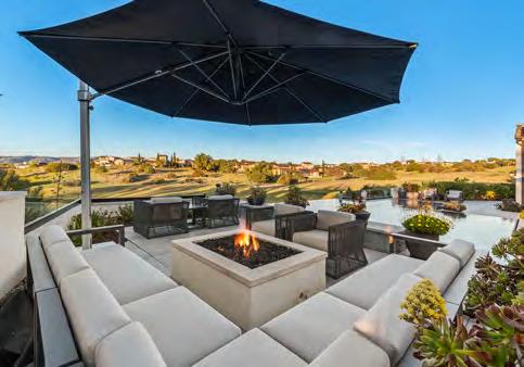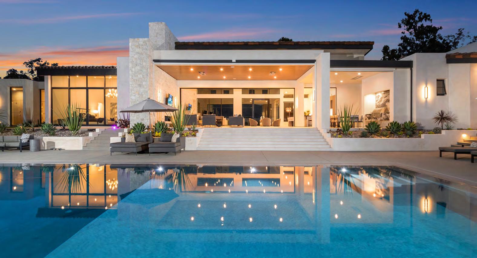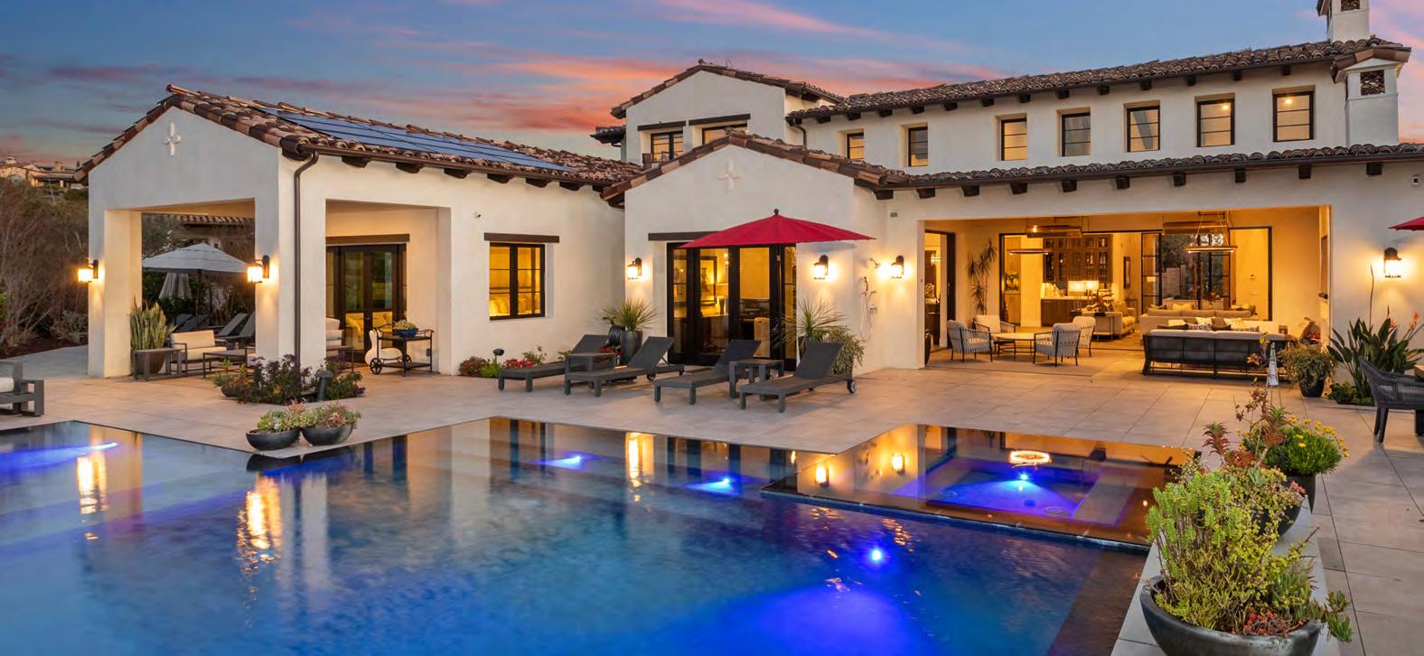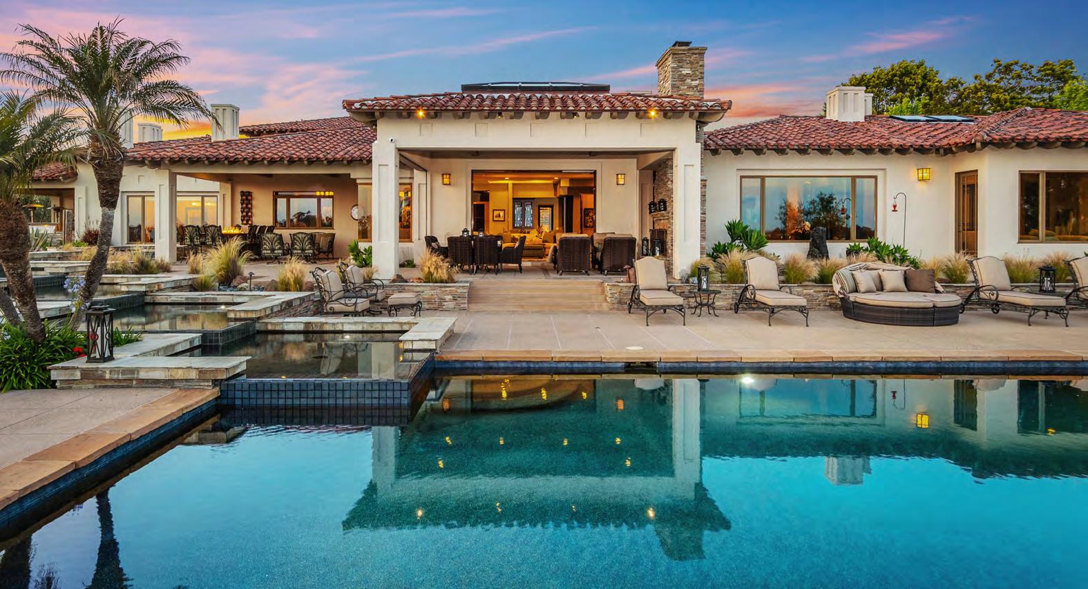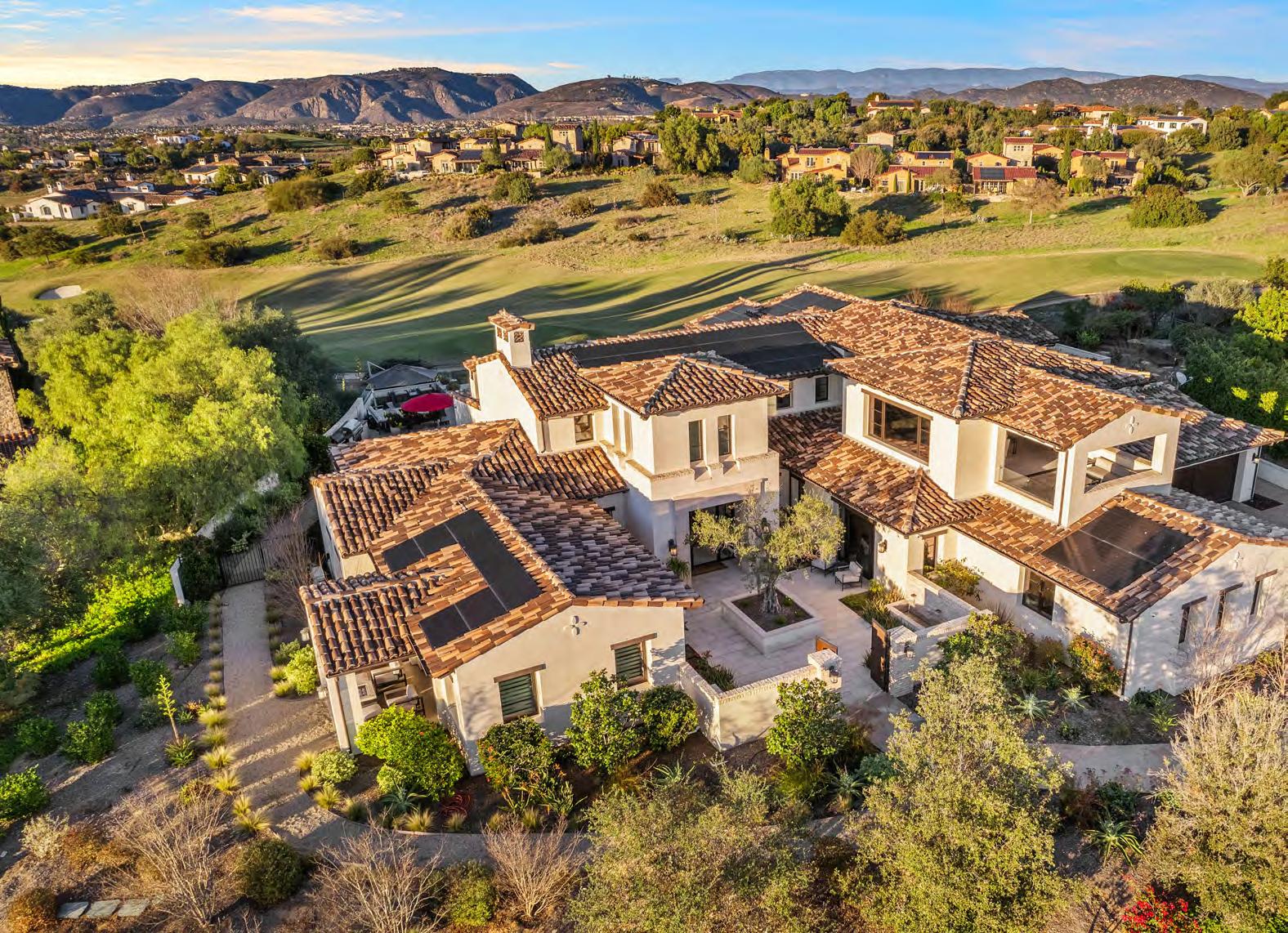 This 2020-built, five en-suite bedroom contemporary home sits perched atop the 18th fairway of The Santaluz Club Rees Jones Golf Course with panoramic views of the course, clubhouse, sunrise and sunset! Arrive through the secluded courtyard adorned with a tranquil waterfall feature and a central olive tree that gracefully embraces the stunning all-glass pivot door entry. The grandeur unfolds as you enter the foyer, revealing the great room’s soaring 25-foot ceiling accentuated by massive wood beams and disappearing doors for the epitome of California indoor/outdoor living. The open floor plan includes a chefs kitchen, gorgeous walk-in pantry, temperature-controlled wine room and adjacent dining room with casual dining banquette. Disappearing doors lead to the covered loggia with fireplace, TV and outdoor heaters, and through to a rear yard oasis with vanishing-edge pool, spa, fire pit, barbecue and smoker. It’s truly an entertainer’s dream! The luxurious 1500-sq.ft. primary suite plus an office, laundry and three expansive en-suite bedrooms are also on the first level. Ascending the grand staircase, you will discover an additional en-suite bedroom and a grand sports room with five televisions, half bath, bar area, and heated covered patio with vistas over the 16th fairway, a panorama all the way to the Del Mar racetrack, and enchanting sunset ocean views. Smart home features include lighting, AV and security systems complete with a 15,000-watt solar system.