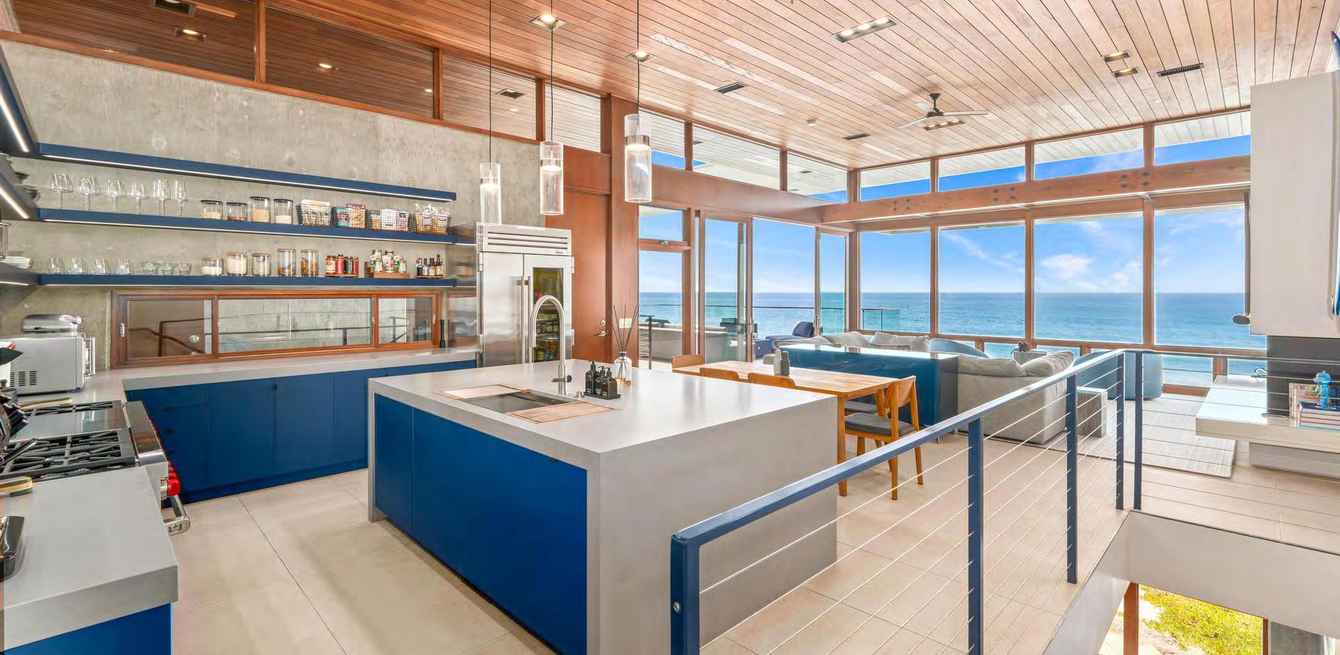 “The chef’s kitchen features captivating blue water views, a center island, plentiful cabinetry, and multiple pantries.”