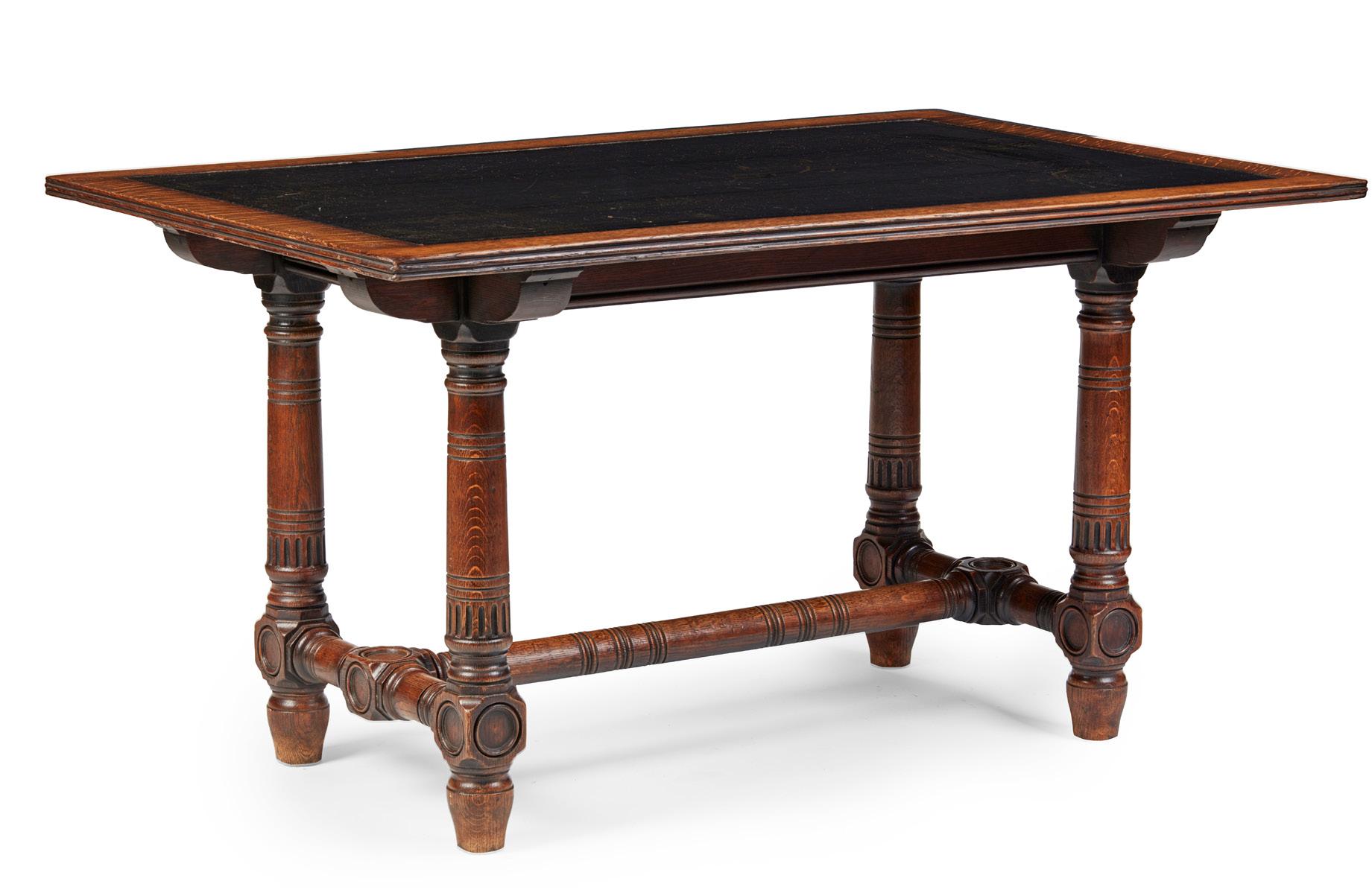 LIBRARY WRITING TABLE, CIRCA 1870 oak, with original tooled leather writing surface 137cm long, 73.5cm high, 91cm deep £1,000-1,500