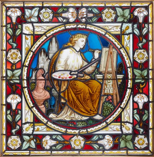 (ATTRIBUTED DESIGNER) FOR CLAYTON & BELL ‘MUSIC’, GOTHIC REVIVAL STAINED GLASS PANEL, CIRCA 1865 painted, stained and leaded glass, later pine frame with brass strengthening bar 86cm square; with frame 94.5cm square £3,000-5,000