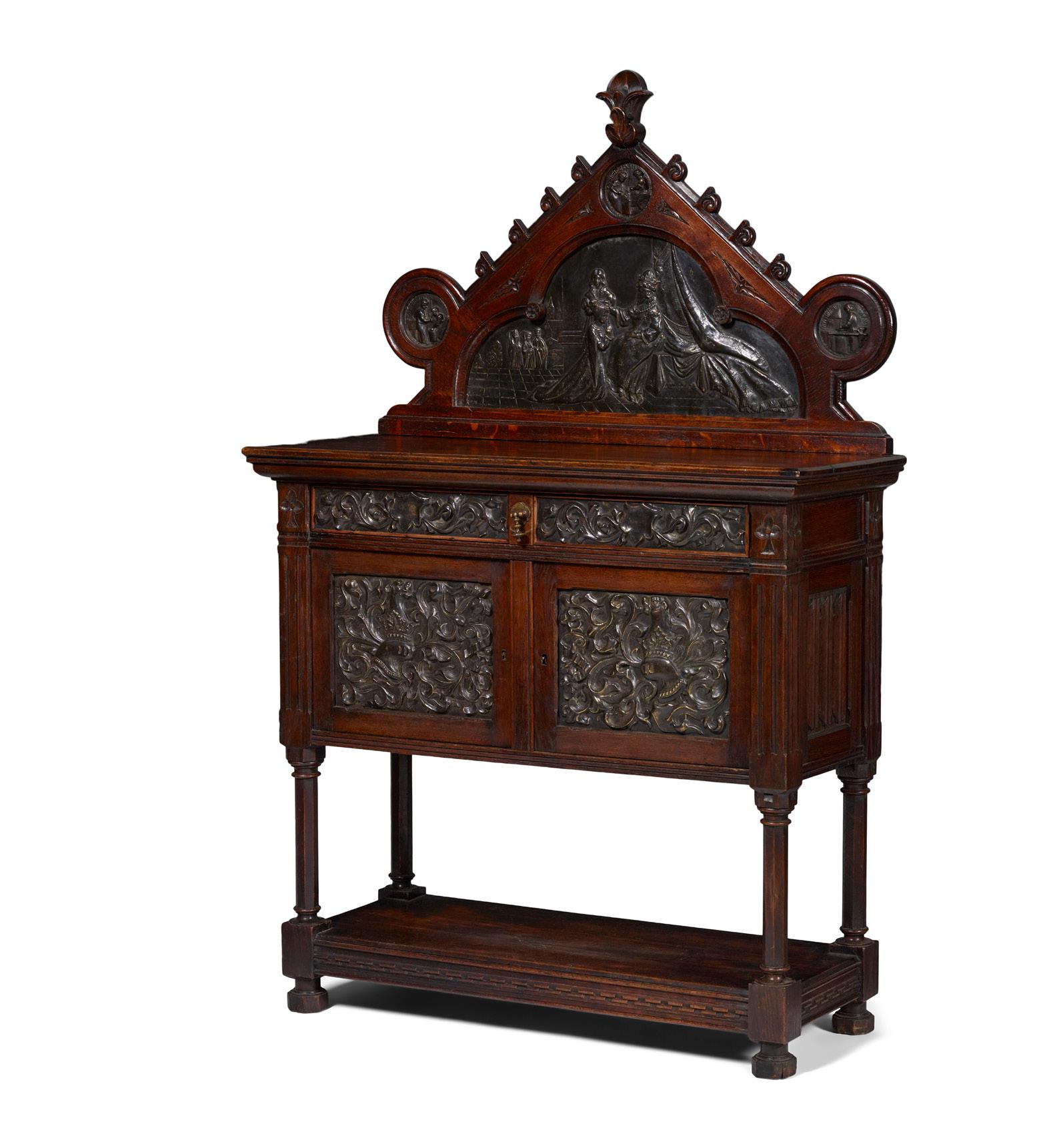 GOTHIC REVIVAL SIDE CABINET, CIRCA 1870 oak, inset with embossed patinated metal panels, brass fittings, signed to central embossed panel A. ARENS 108cm wide, 167cm high, 42.8cm deep £500-800