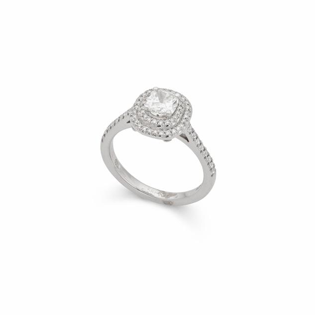 Claw-set with a cushion-cut diamond, the double border and shoulders set with round brilliantcut diamonds