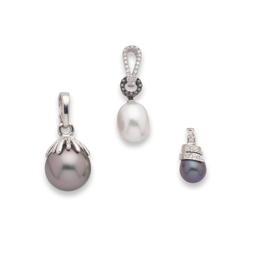 Including an ovoid cultured pearl, black and colourless diamond pendant, stamped 750; a cultured black pearl and diamond pendant, modelled in 18ct gold; and a Tahitian pearl and diamond pendant, modelled in 18ct gold (3)