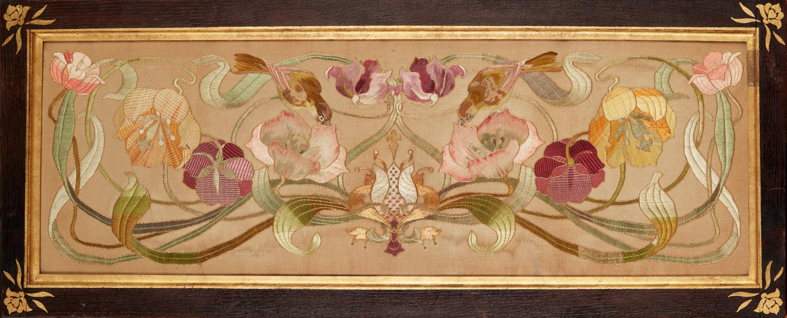 ARTS & CRAFTS TWO-FOLD FIRESCREEN, CIRCA 1890 carved mahogany, each fold inset with embroidered panels of coloured wools on a wool ground each fold 59.5cm wide, 124cm high