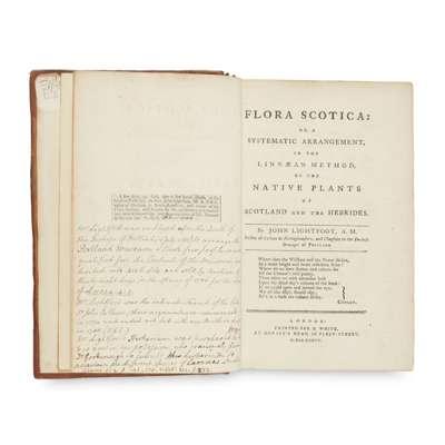Lightfoot, John FloraScotica London, 1777 2 volumes, 8vo, 35 engraved plates, additionalengraved titles, contemporarycalf neatlyrebacked with later spine, bookplateof WilliamA Clarke, numerous contemporaryannotations, somefoxing and offsetting (2)