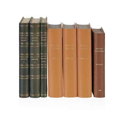 Including Miller, Philip TheGardener's Dictionary London:Printed for theAuthor, and sold byJohn Rivington…, 1759. Seventh edition, folio;Loudon, J.C. Arboretumet FruticetumBritannicum London:Longman, Orme, Brown, Green, and Longmans, 1838. 8 volumes, 8vo, 406 (of 412) engraved plates, modern green half morocco;Idem TheGardener's Magazine London:Longman, Brown, Green, and Longmans, 1843. VolumeXIX only, 8vo, modern green cloth gilt;Nicol, Walter TheGardener's Kalendar Edinburgh:Archibald Constable , 1812 Second edition, 8vo, contemporarycalf, rebacked with modern spine;Idem. ThePlanter's Kalendar… Edinburgh:Archibald Constable , 1812 8vo, modern boards;Idem Another copy, modern orangecloth;Langley, Batty. New Principles of Gardening. London:A. Bettersworth and C Hitch , 1739 4to, plates, modern brown cloth gilt;The Gardener's New Kalendar… London:T. Osborne, 1758. 8vo, modern brown cloth gilt;Mawe, Thomas EveryMan his own Gardener London:C Crowder…, 1779. Eighth edition, 12mo, modern brown cloth gilt;Reid. John. TheScots Gardiner Edinburgh:James Reid, 1756 12mo, contemporary calf with orangespeckles rebacked with modern spine;Robinson, W. The English Flower Garden London:John Murray, 1895 Fourth edition, 8vo, originalbluecloth gilt;Sold not subject to return (18)
