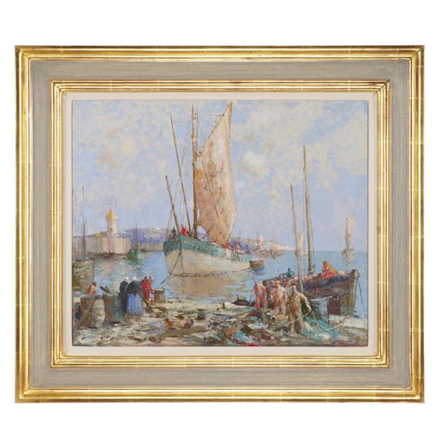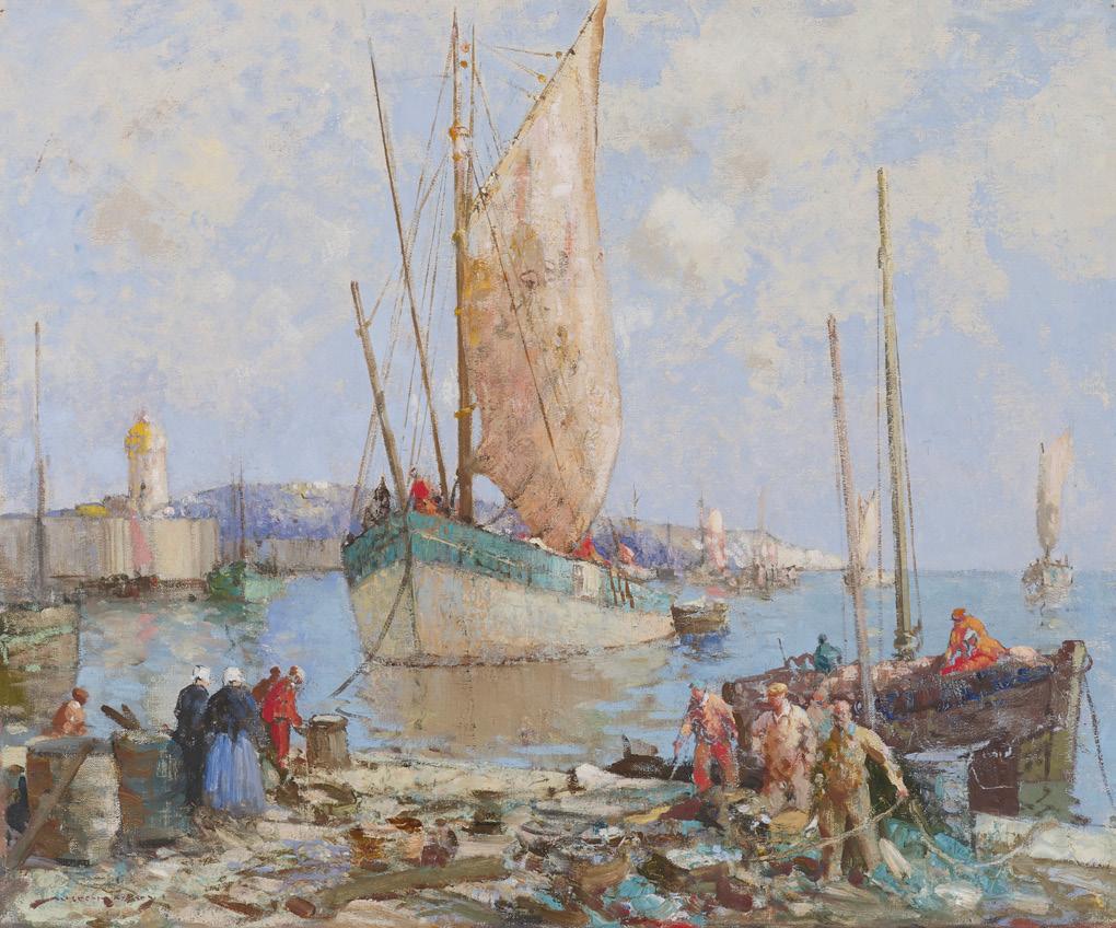 Imagery of boats and ships also appealed to Shaw, whether on the banks of canals, as seen in On the Canal by William Alfred Gibson (1866-1931), at full sail as in On the Thames by James Campbell Noble (1846-1913) and A Brigantine in a Breeze-Off, Firth of Clyde by Patrick Downie (1854-1945) or at anchor, as in Boat in Harbour by William Page Atkinson Wells (1872-1923) and On the Quayside by James Hamilton MacKenzie (1875-1926).
