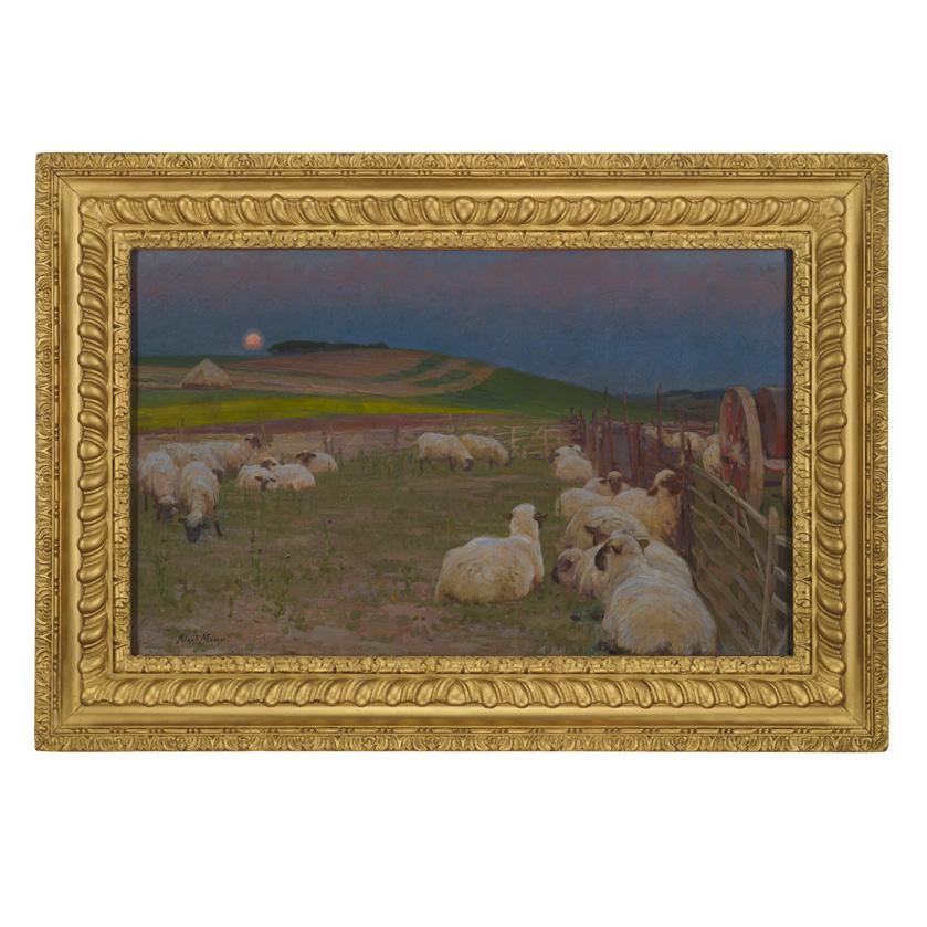 These themes within Shaw’s collection chimed with his love of depictions of rural life and the cycle of the seasons, including imagery of countrymen and women and their animal companions. As a result, paintings such as Harvest Time by Duncan Cameron (1837-1916), Homeward by Joseph Farquharson (1846-1935), Ayrshires in Dappled Sunlight by David Gauld (1865-1936), Harvest Moon by Alexander Mann (1857-1922), Home from the Fields by Harrington Mann (1864-1937), The Fisherman’s Family and
