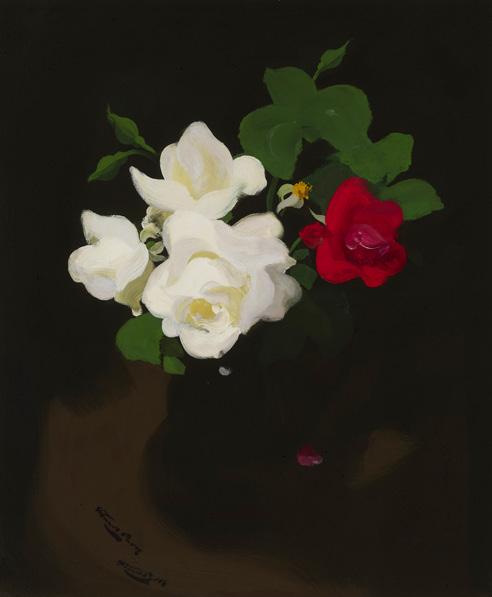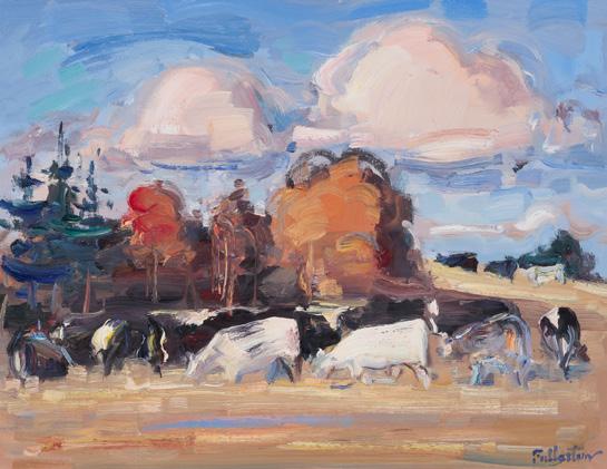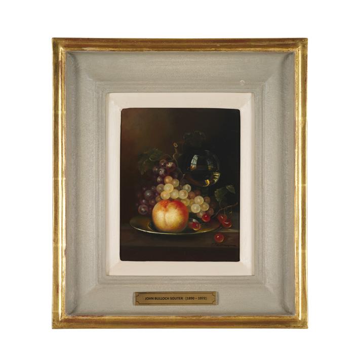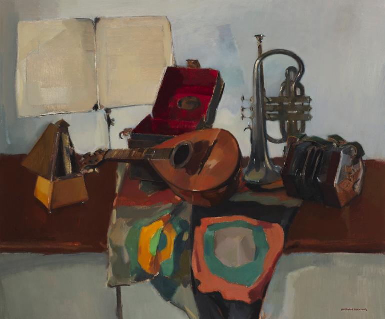 Shaw’s deep-seated appreciation of Scottish art also extended to the still life. Of particular note amongst his acquisitions in this field are the serene A Still Life of Peony Roses by Joseph Farquharson (1946-1935) , the realist Stilllife of Ham on a Silver Platter by Alexander Goudie (19332004) and the ambitiously composed Still Life with Mandolin by Norman Kirkham (1936-2021). David McLeod Martin’s Striped Mug and Mackerel strikes a modern note which contrasts with the classical beauty of Walter Graham Grieve’s Still Life with Daisies. Few Scottish art collections would be considered complete without a still life by James Stuart Park (1862-1933) represented here by Red Roses as well as Red and White Roses, whilst the virtuoso realism of William Oliphant Hutchison (1889-1970) can be argued to have its successor in that of David Ross Warrilow (b.1956).