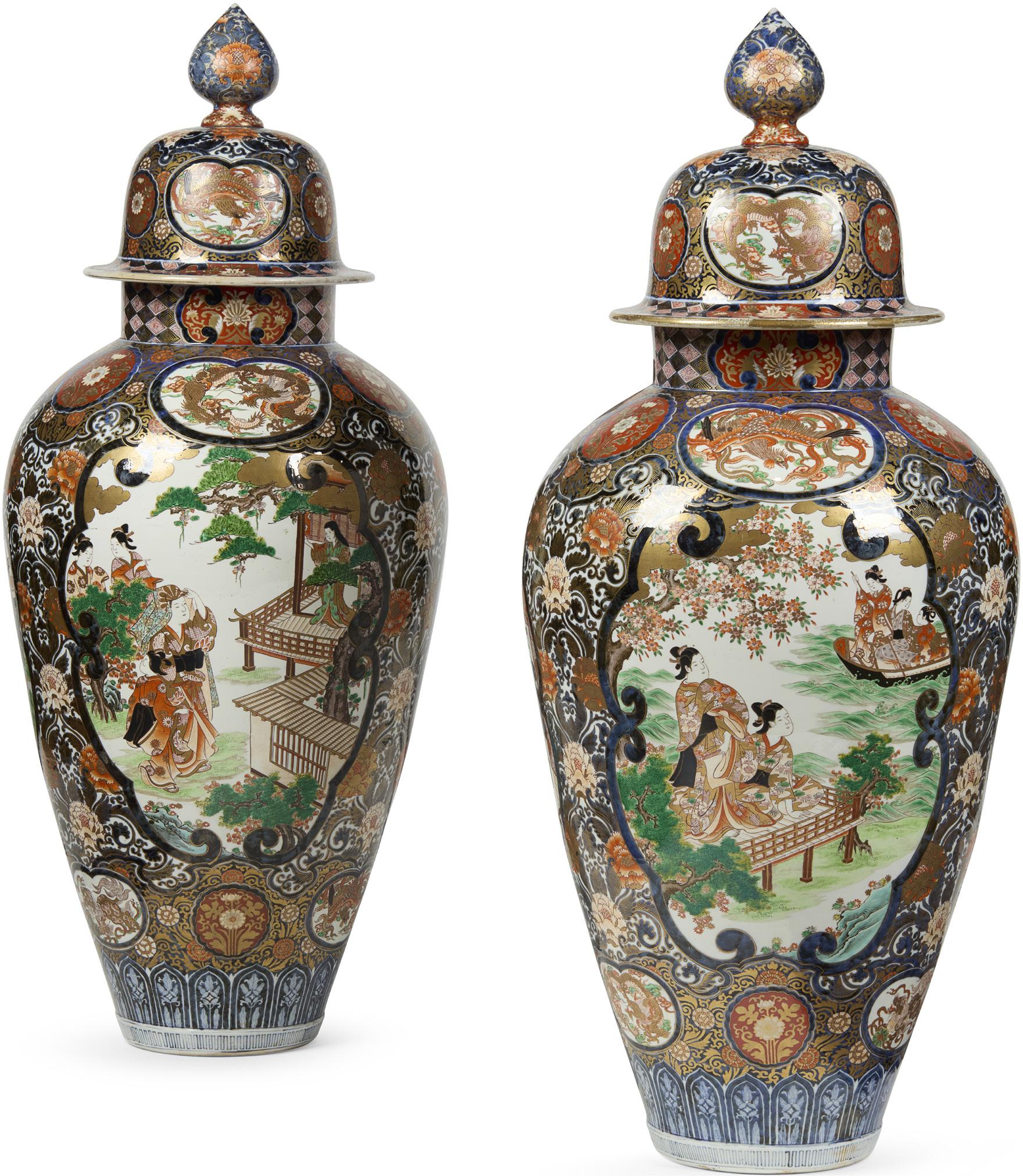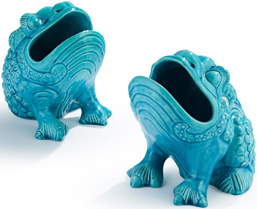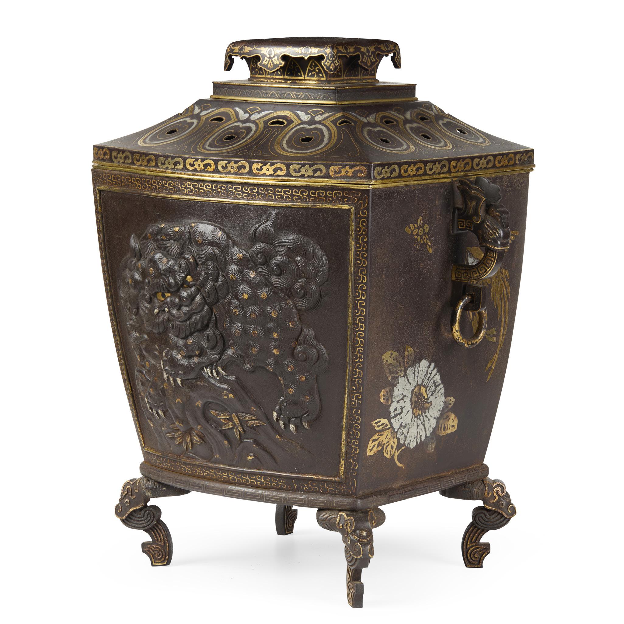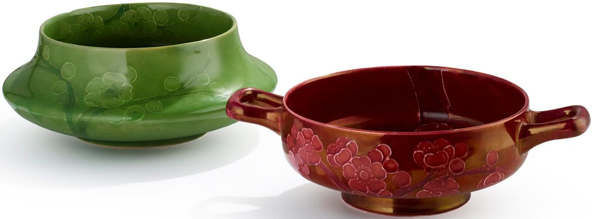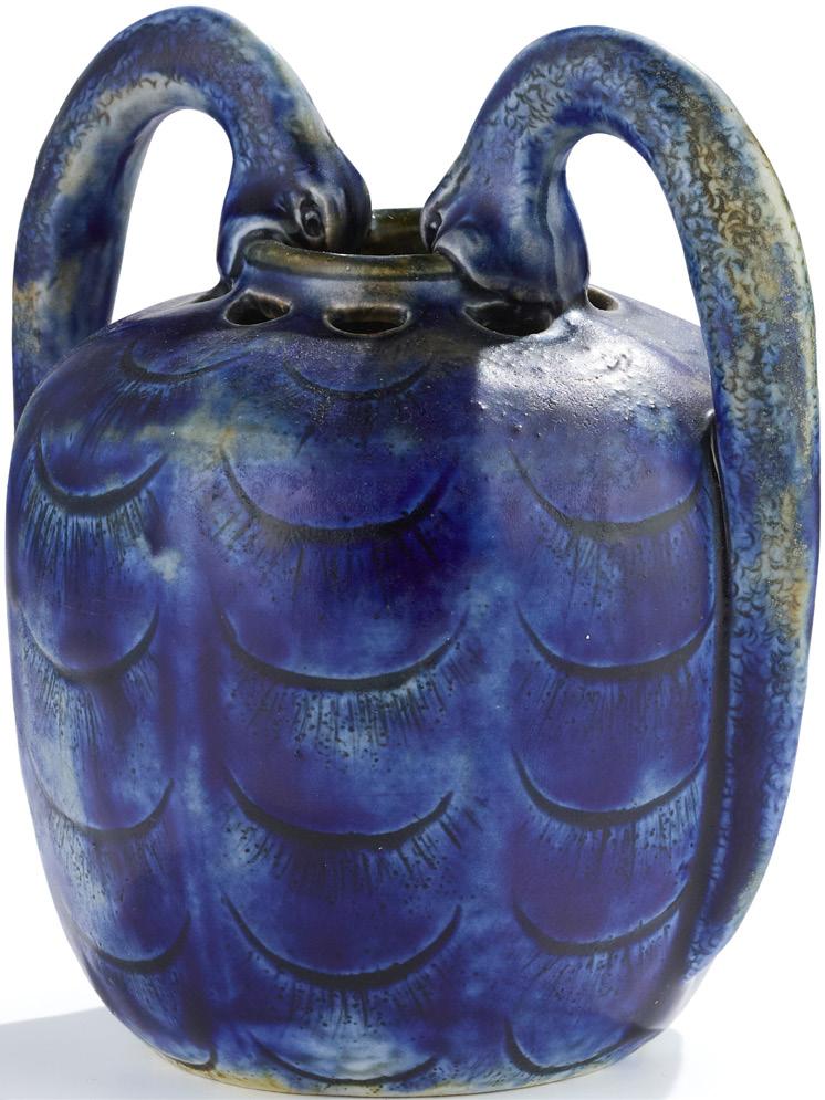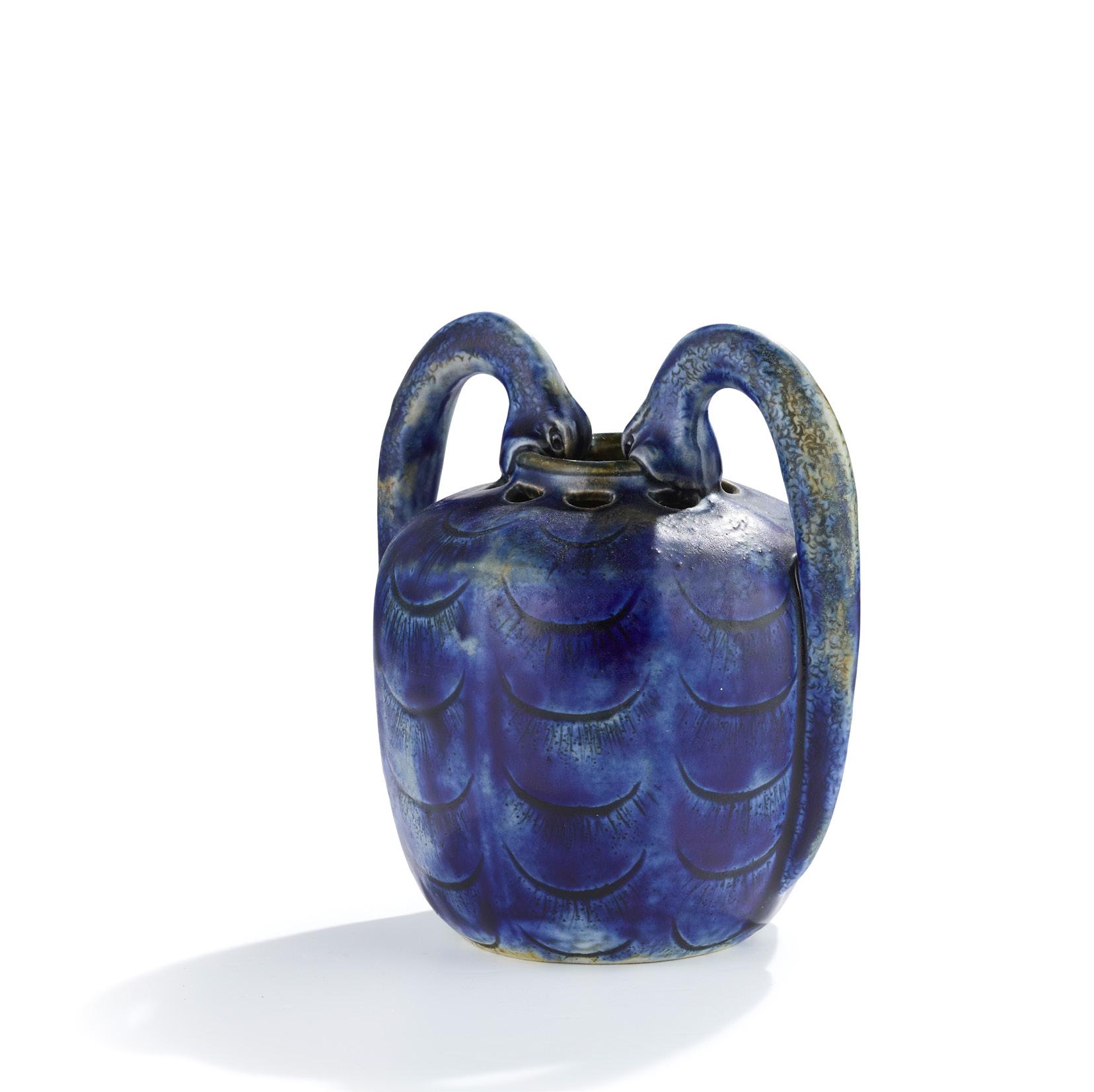These distinctive characteristics are exemplified in the ceramics presented here. A vase made in 1884 (lot 7), for instance, features four vividly expressive faces, showcasing both technical mastery and a whimsical artistic vision. The ‘Four Dragons Vase’ of 1889 (lot 13) and the ‘Aquatic Jug’ of 1898 (lot 2) further highlight their fascination with fantastical and marine life themes.