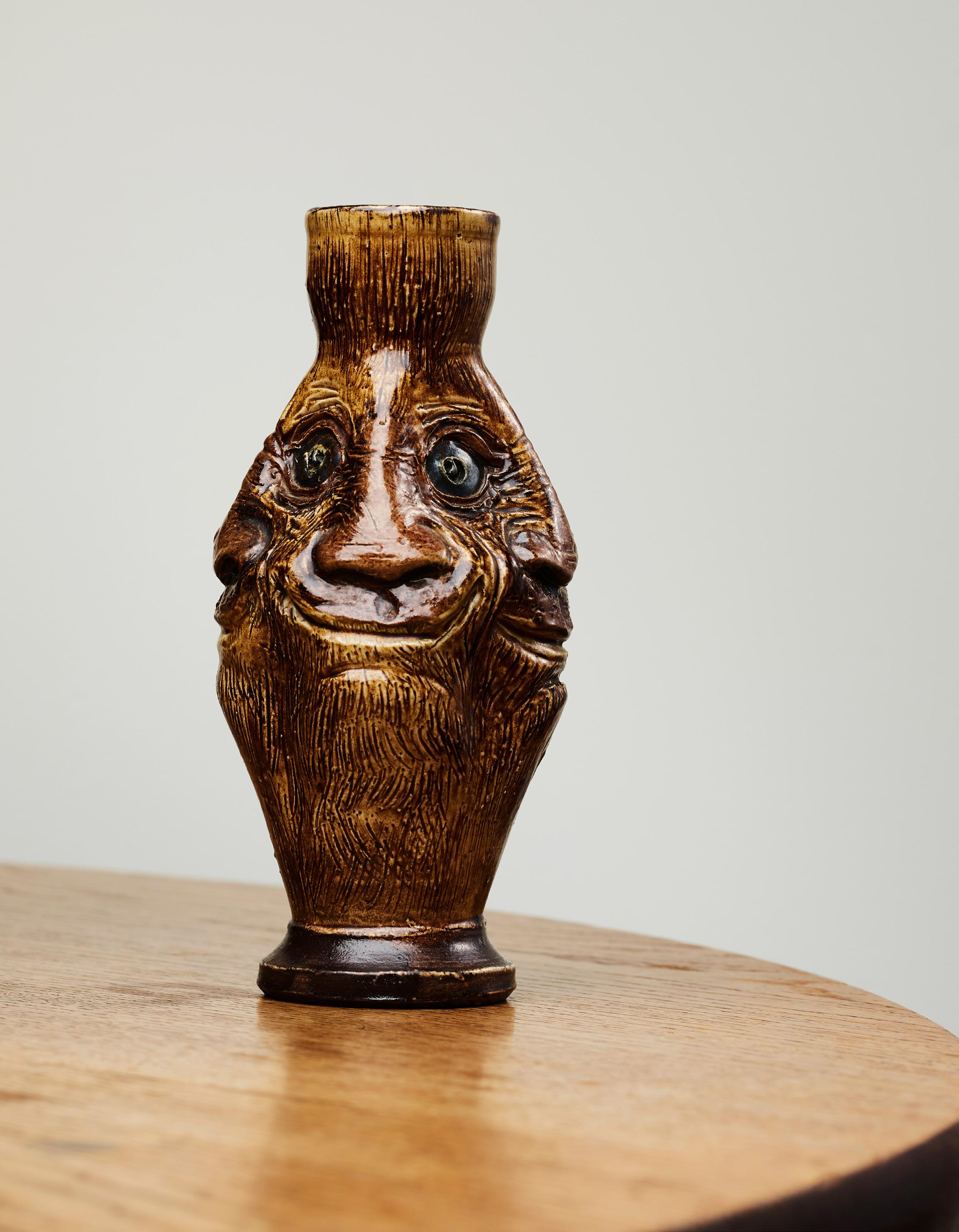 The brothers mastered salt-glazed stoneware, a technique that preserved intricate surface engravings and resulted in their signature semi-matt, speckled finish in earthy hues of browns, blues, and greens. Their work, often featuring mythical creatures, grotesque faces, and nature-inspired motifs, blended English and German influences. Trained as a sculptor, Robert Wallace elevated ceramics to an art form and became best known for his grotesque designs, including jars adorned with expressive faces, grinning underwater creatures, and humanoid “Wally birds.”