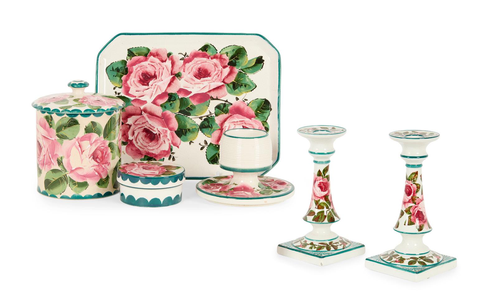 glazed earthenware, comprising; a PAIR OF ‘CABBAGE ROSES’ SQUARE BASE CANDLESTICKS, 18cm high; a TRAY, painted by James Sharp, 26cm wide; a BISCUIT BARREL, 15cm high; a MATCH STRIKER, 9cm high; a LOW POMADE, 8.8cm diameter, various printed, impressed and painted marks (6)