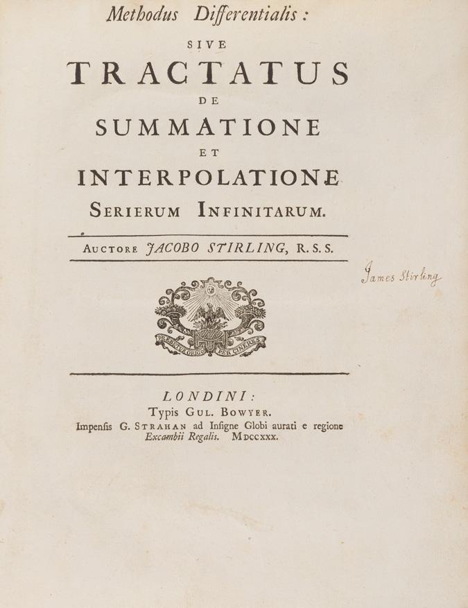 By that time Stirling’s status as a non-juring student and his alleged involvement in Jacobite agitation had already led to trouble with the university authorities, and his scholarships appear to have been withdrawn shortly before the book was published. He therefore left Oxford without a degree, taking up an invitation to Venice from Nicolas Tron, the Venetian ambassador to London. Stirling was in Italy for several years, and became known in his family as ‘the Venetian’ in consequence. During this time Stirling attended the university of Padua and made the acquaintance of scholars including Nicolaus Bernoulli. In 1719 he wrote to Newton from Venice thanking him for an unspecified act of generosity, usually interpreted as a gift of money, and in the same year communicated to the Royal Society his paper ‘Methodus differentialis Newtoniana illustrata’, the basis for his magnum opus, the Methodus differentialis sive tractatus de summatio et interpolatio serierum infinitarum, which was published in 1730. Stirling’s holograph manuscript of the Methodus, his corrected copy of the first edition, and a copy of the first edition in English are all present in his library.